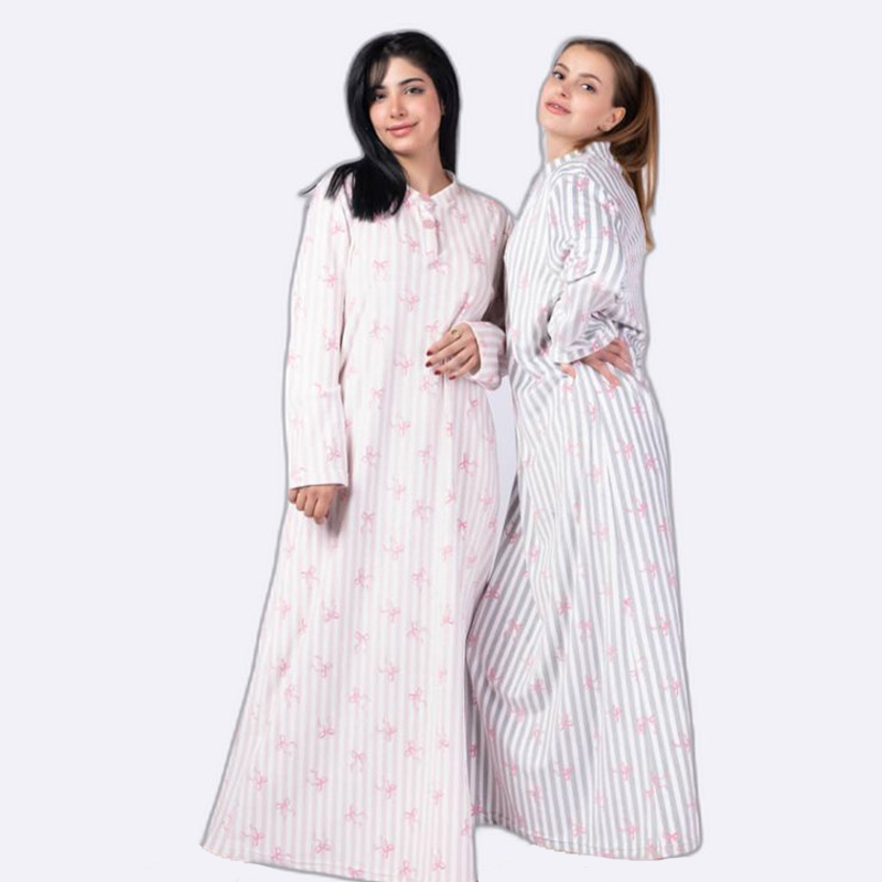 استمتعي بنوم هانئ ومريح مع طقم قميص النوم الأنيق ذو الأكمام الطويلة والمخطط برباط. تصميم عصري ومريح يجعلك تشعرين بالراحة والأناقة في آن واحد.
