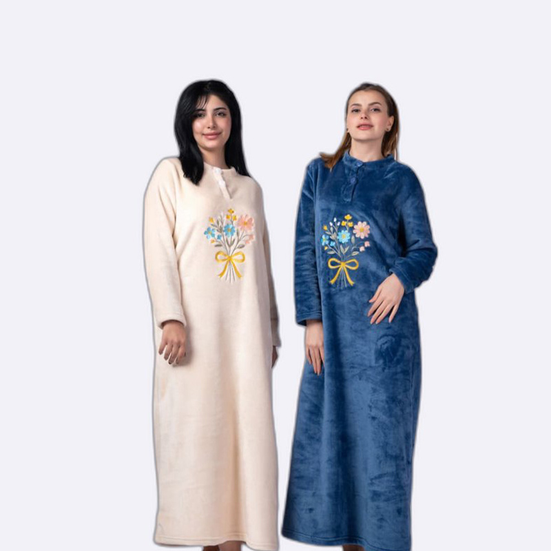 استمتعي بالدفء والأناقة مع قميص النوم الفليس المطرز بالورود. تصميم مريح وأنيق يمنحكِ إحساسًا بالراحة والاسترخاء طوال الليل.