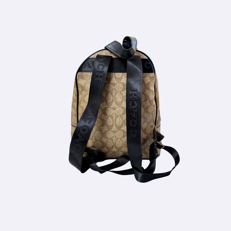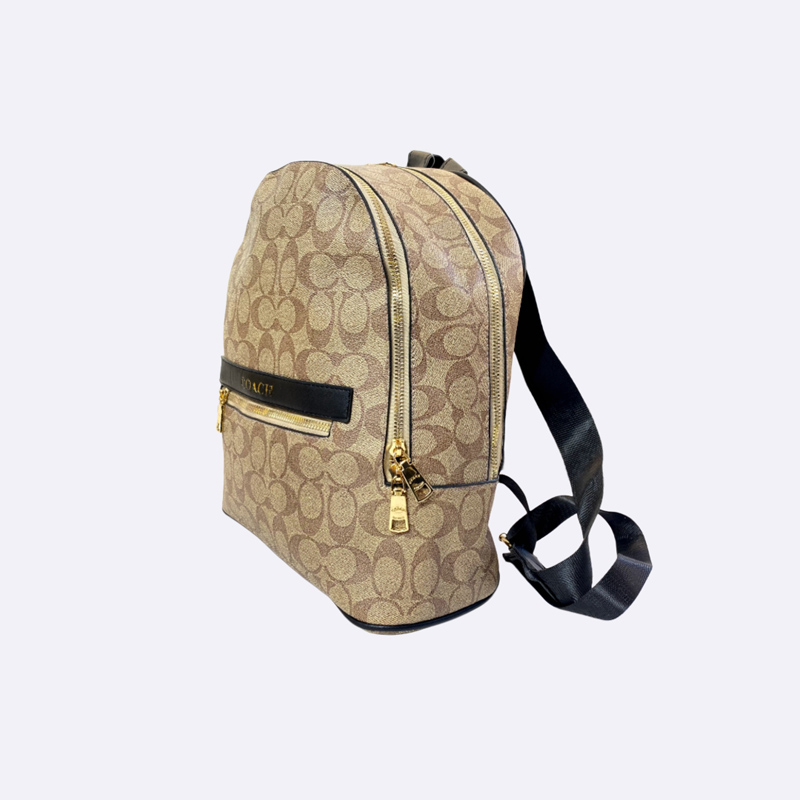 حقيبة ظهر نسائية أنيقة ومميزة، مصنوعة من قماش بطبعة شعار "C" الشهير من "Coach" باللونين البيج والبني. تتميز بتصميم كلاسيكي، مع سحّابات ذهبية اللون وجيب أمامي بسحاب أسود