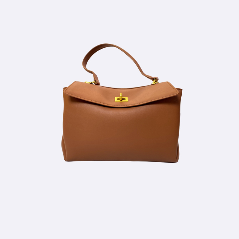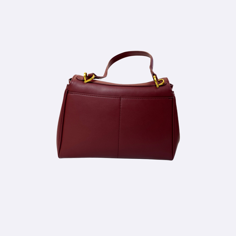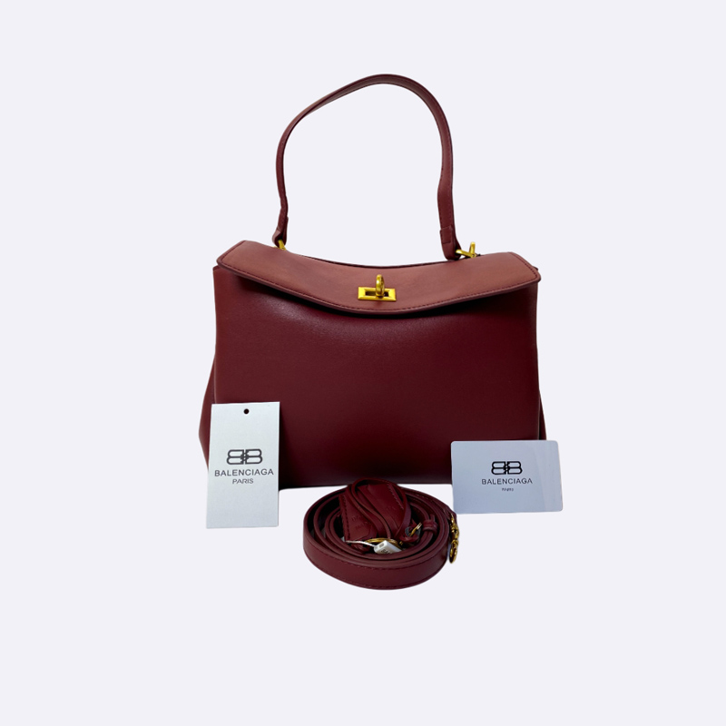 حقيبة يد أنيقة من بالنسياغا باللون العنابي، مصنوعة من الجلد. تتميز بمقبض علوي وقفل أمامي ذهبي، مع حزام كتف إضافي قابل للتعديل