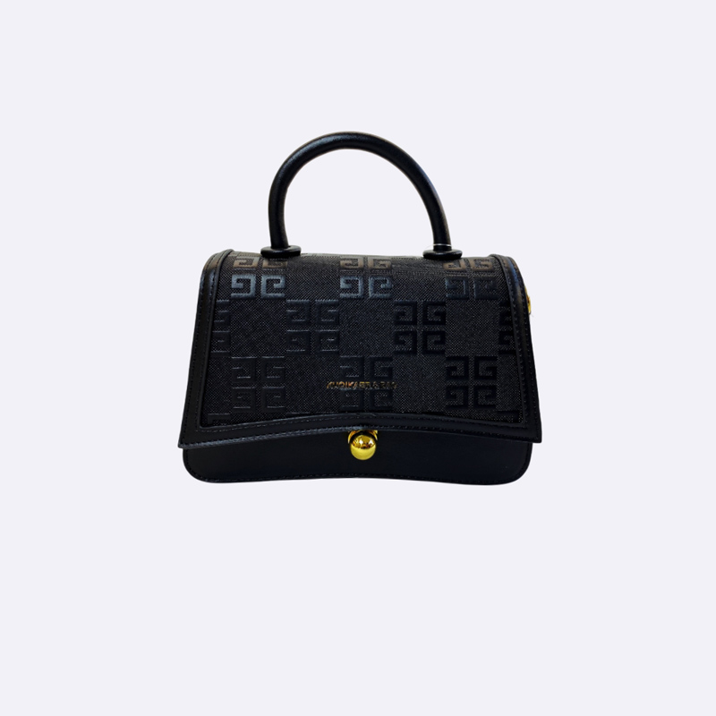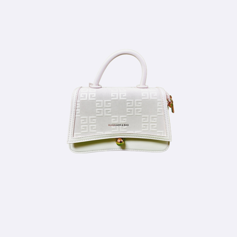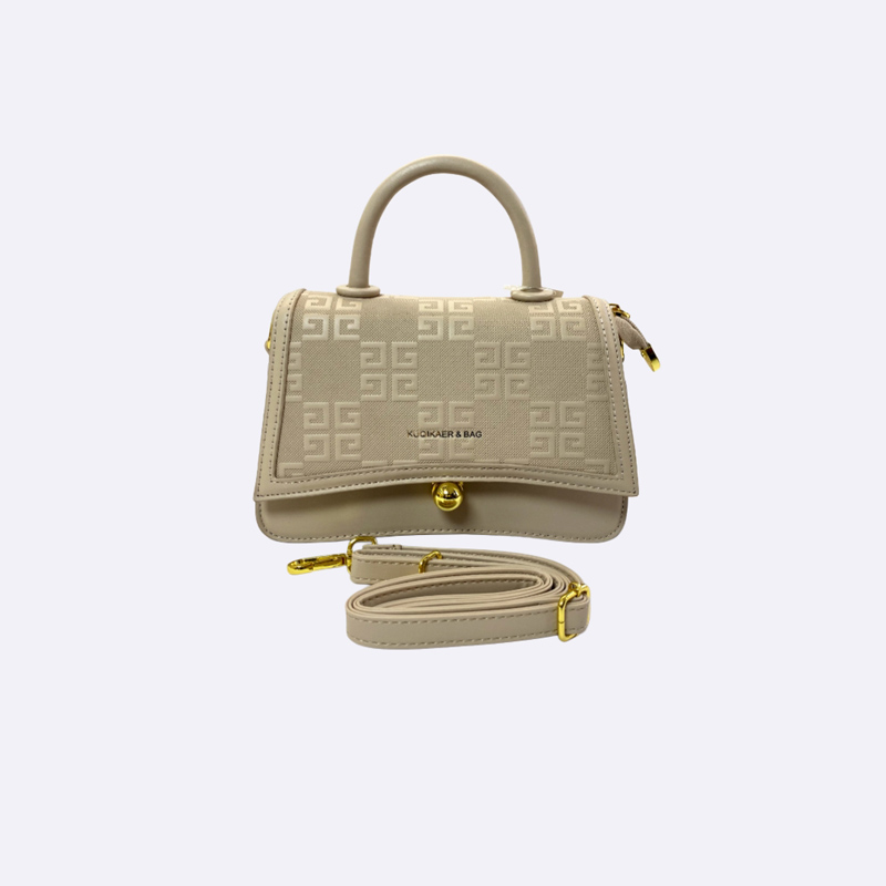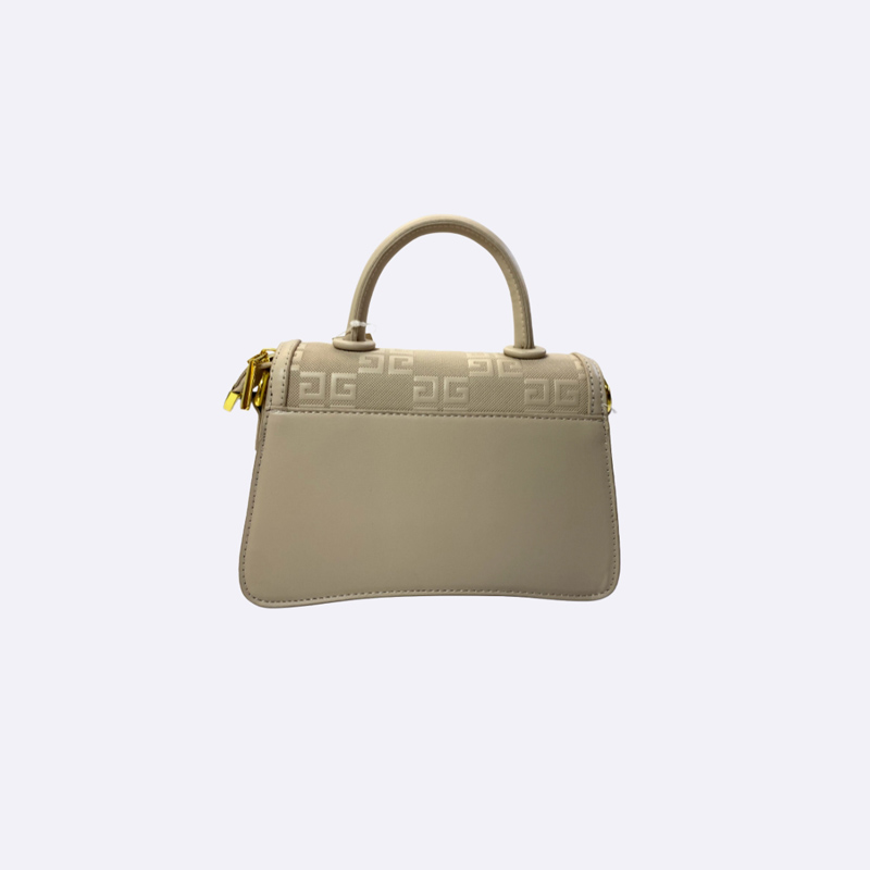 حقيبة يد نسائية أنيقة باللون البيج الفاتح، تتميز بتصميم كلاسيكي وطبعة مونوجرام بارزة. تأتي بمقبض علوي وحزام كتف قابل للتعديل، مع قفل أمامي معدني ذهبي.