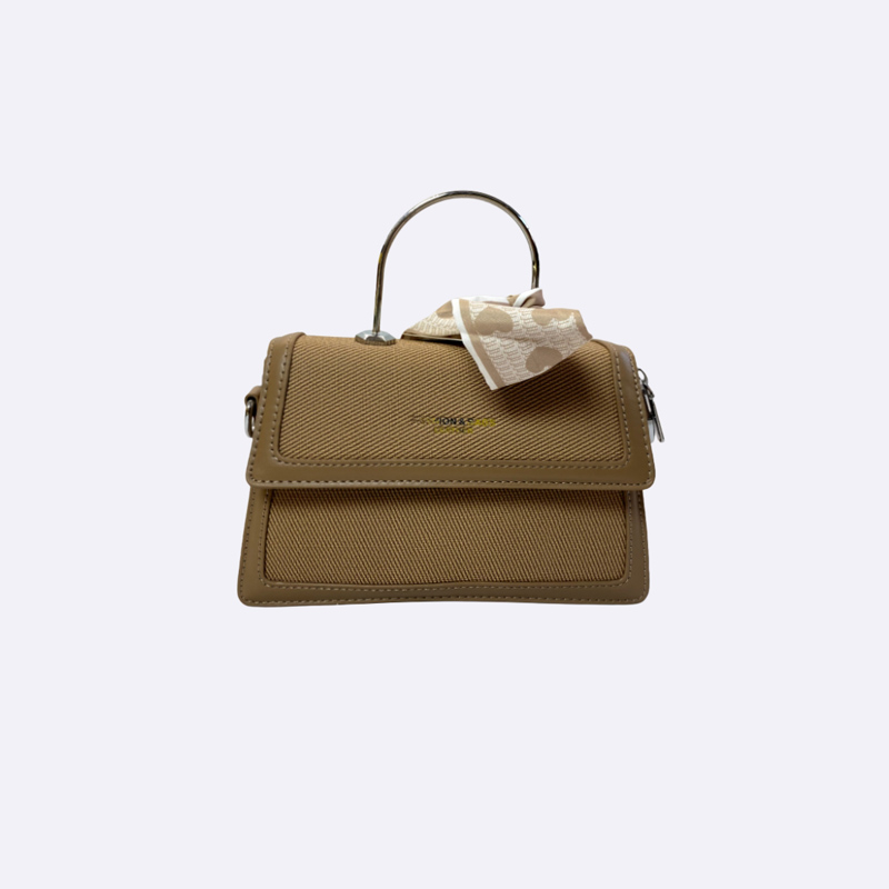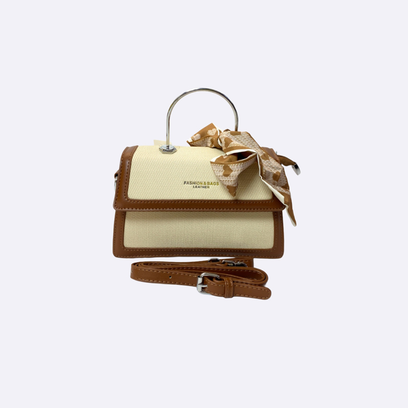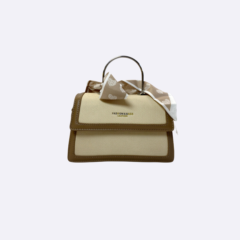 حقيبة يد أنيقة تجمع بين قماش الكانفاس باللون البيج الفاتح والجلد البني. تتميز بمقبض علوي معدني، وشريط مزخرف، وحزام كتف قابل للتعديل.