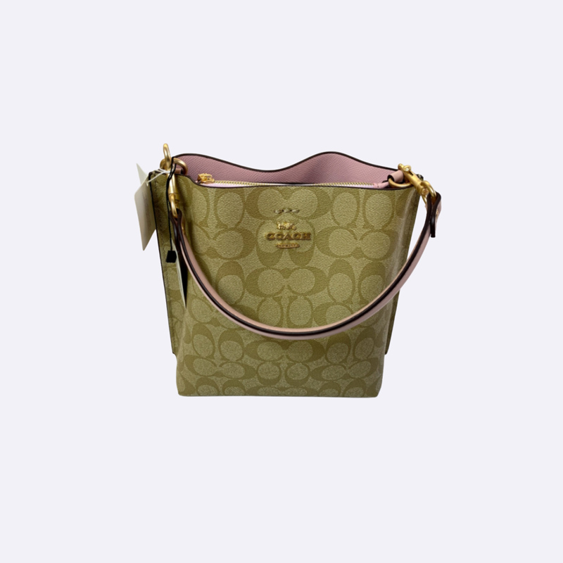حقيبة يد أنيقة من ماركة كوتش، بتصميم دلو ولون بني فاتح. مزينة بنقش شعار الماركة الشهير ومزودة بحزام كتف.