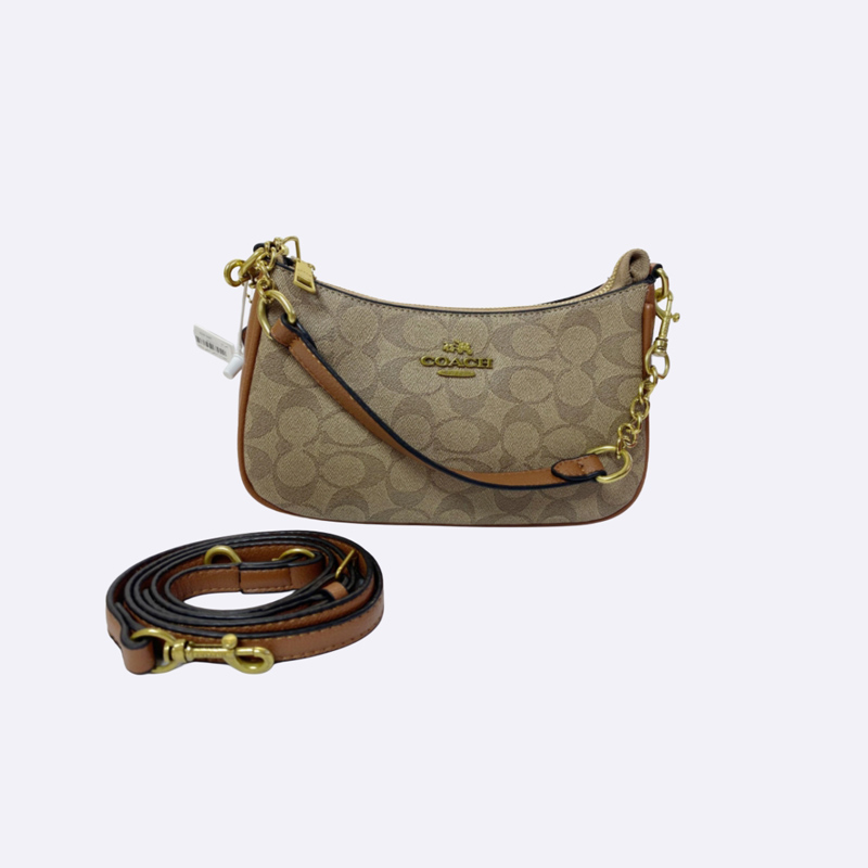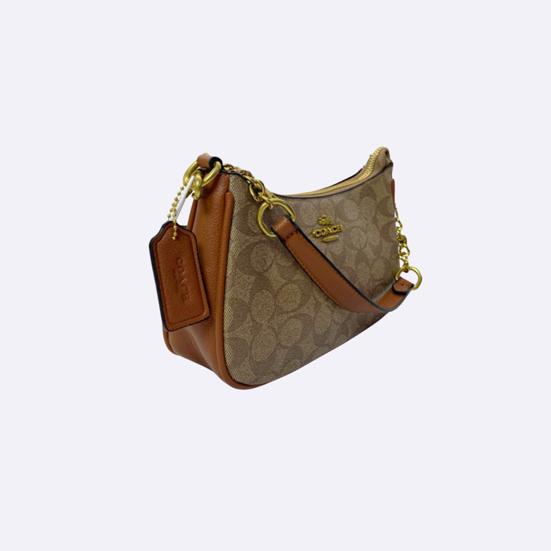 حقيبة كتف صغيرة أنيقة من ماركة "كوتش" بتصميم "سيجنتشر" الكلاسيكي، مزودة بسلسلة ذهبية وحزام جلد قابل للتعديل والفصل، مثالية لحمل الأساسيات اليومية.