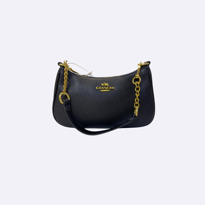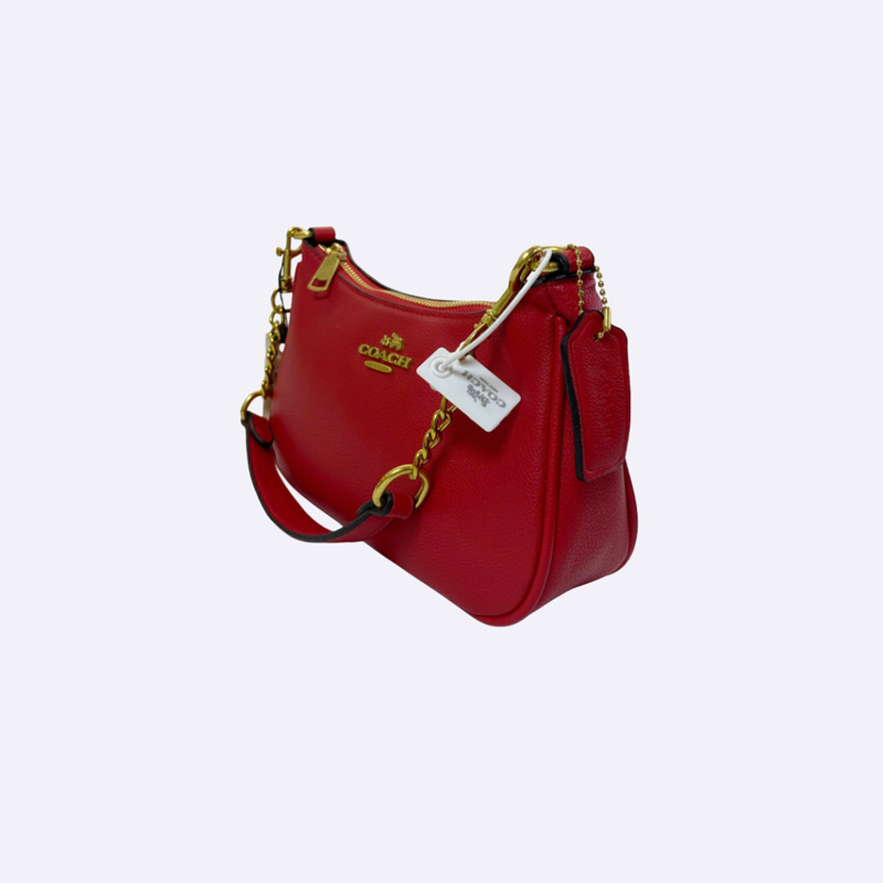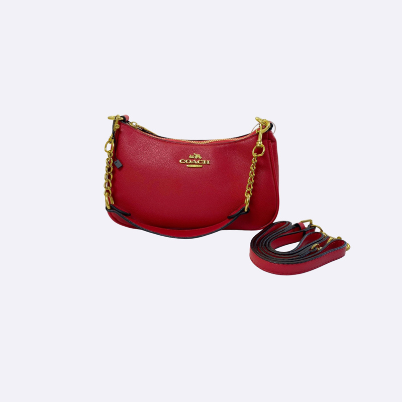 حقيبة كتف صغيرة أنيقة من ماركة "كوتش" باللون الأحمر الجذاب، مصنوعة من الجلد الفاخر ومزودة بسلسلة ذهبية وحزام جلد قابل للتعديل، مما يجعلها مثالية لإضافة لمسة لون مميزة لإطلالتك.
