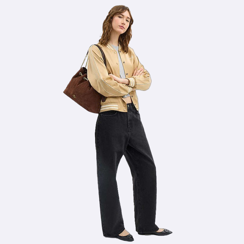أضيفي لمسة من الفخامة إلى إطلالتك مع حقيبة الدلو الأنيقة من كوتش. مصنوعة من جلد السويدي المبطن مع تفاصيل سلسلة ذهبية، هذه الحقيبة مثالية لحمل جميع ضرورياتك اليومية بأناقة.