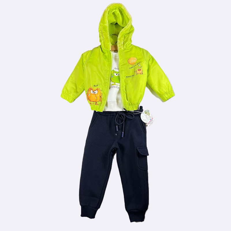 أطلقي العنان لخيال طفلك مع هذا الطقم المكون من 3 قطع بتصميم الوحوش المرح. يشمل جاكيت عصري، بنطلون رياضي مريح، وتي شيرت أنيق لإطلالة عصرية ومريحة.