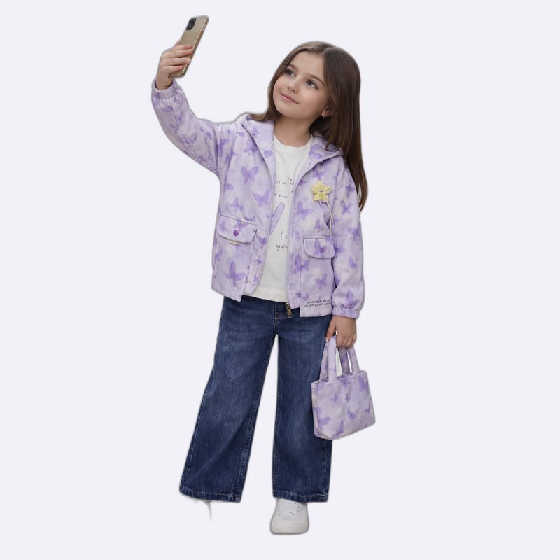 أطلقي العنان لخيال طفلتك مع هذا الطقم الرائع! جاكيت أنيق مزين بالفراشات مع حقيبة متناسقة لإطلالة عصرية ومميزة.