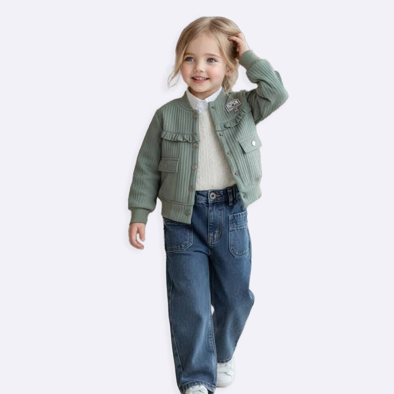 أطلقي العنان لأناقة طفلتك مع هذا الطقم العصري! جاكيت أنيق مزين بالكشكشة مع جينز مريح، مثالي لإطلالة عصرية ومميزة.