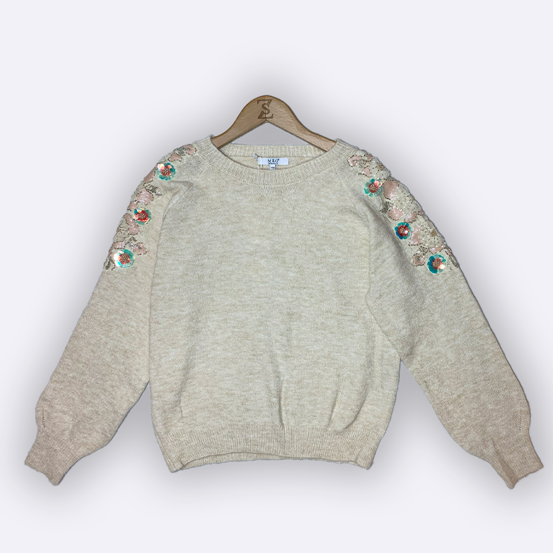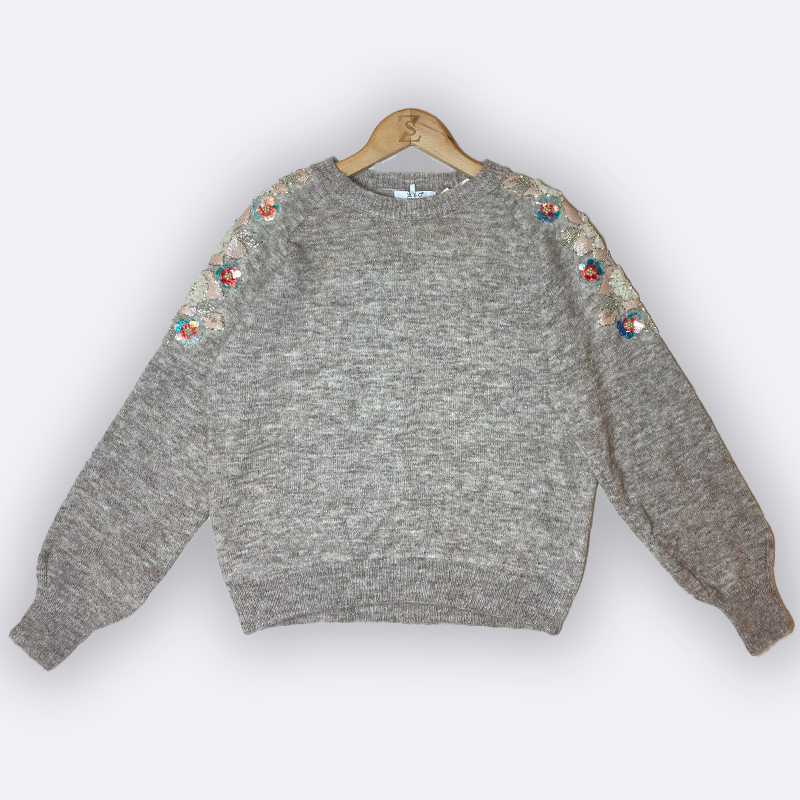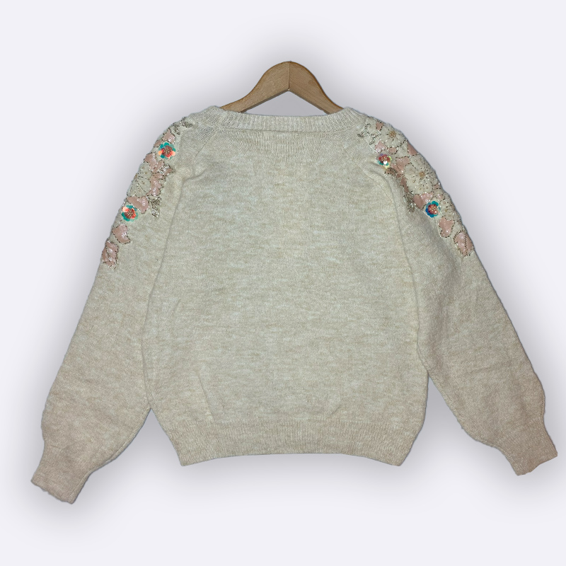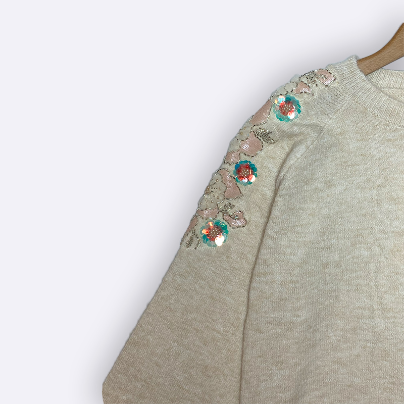 كنزة صوف نسائية بأكمام طويلة مزينة بتفاصيل ترتر لامعة على الكتفين.