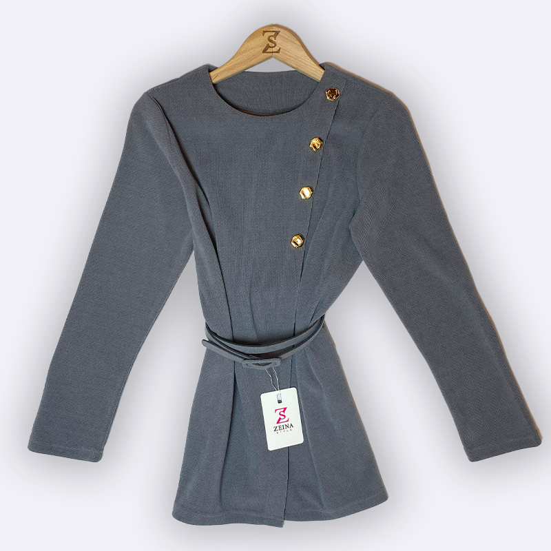 بليزر نسائي بأكمام طويلة وملمس مضلع، مزود بحزام وأزرار ذهبية أنيقة.