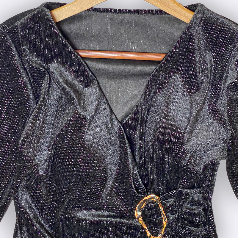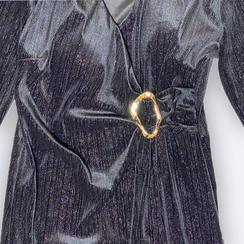 فستان سهرة مخملي لامع بفتحة رقبة على شكل حرف V وتصميم ملفوف (Wrap)، يتميز بشق أمامي ومشبك ديكوري ذهبي عند الخصر.