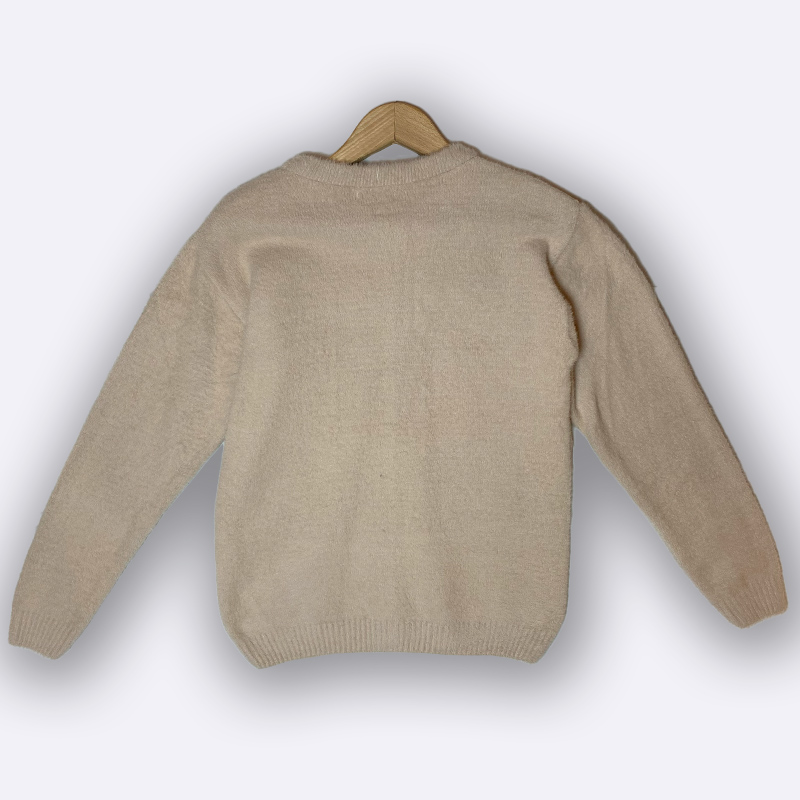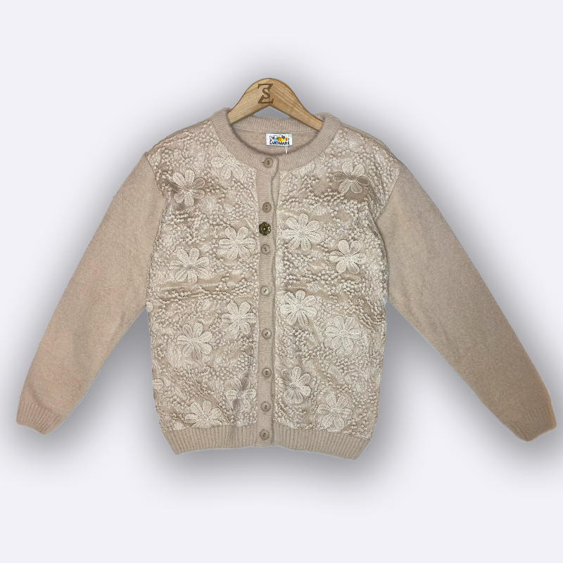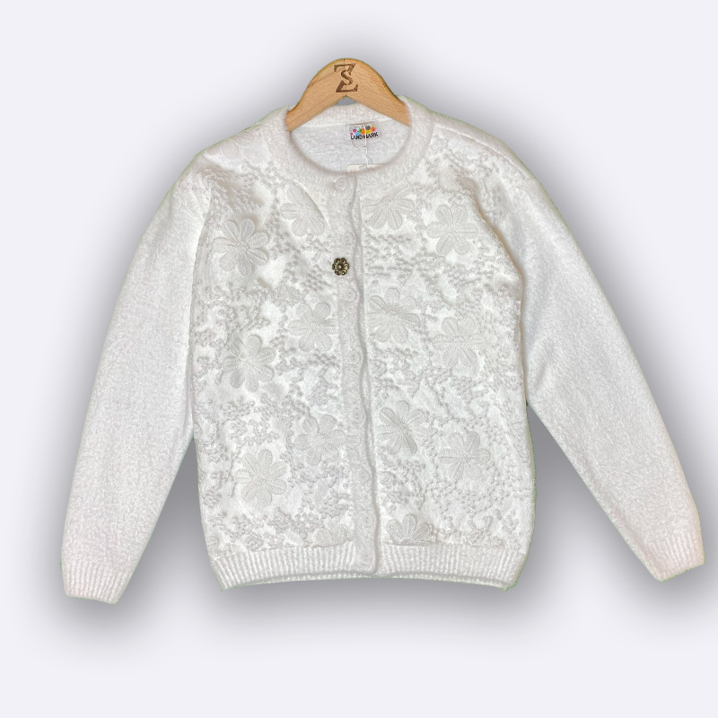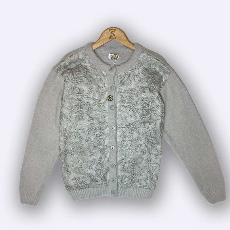 كارديغان صوفي محبوك بأزرار أمامية، يتميز بتغطية من الدانتيل ثلاثي الأبعاد بنقشة أزهار على الصدر، وأكمام سادة. مثالي للارتداء الخفيف والأنيق.