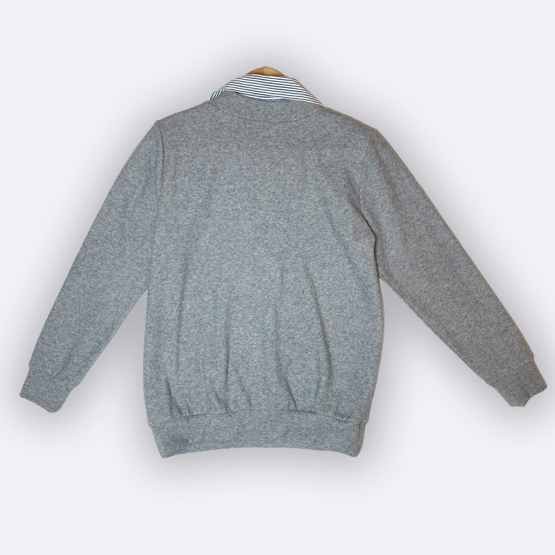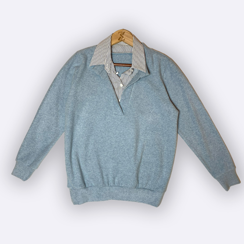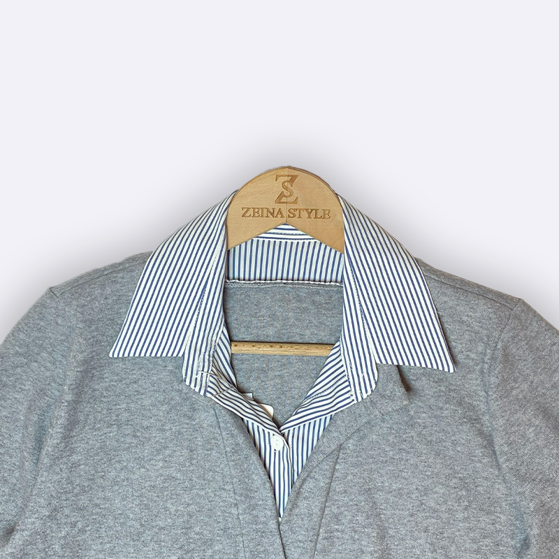 كنزة نسائية دافئة ومريحة بتصميم طبقتين، تتميز برقبة قميص كلاسيكية بنمط مقلم (أبيض وأزرق داكن) وياقة مفتوحة صغيرة، مع حواف مضلعة عند الخصر والأكمام لمظهر أنيق وعصري.