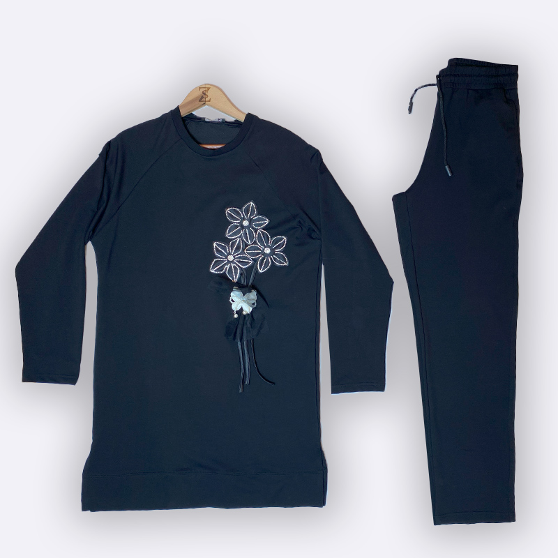 طقم نسائي مكون من قطعتين (بلوزة طويلة وبنطلون) بتصميم مريح ودافئ. تتميز البلوزة برقبة دائرية وتطريز زهري بارز ثلاثي الأبعاد مع لمسات من الخرز والشرائط الشبكية، مثالي للمنزل أو الإطلالات الكاجوال المريحة.