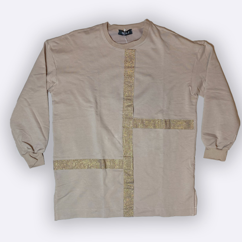 طقم بيجامة نسائي فاخر مكون من بلوزة طويلة وبنطلون مريح، يتميز بتفاصيل لامعة من الترتر على الصدر لإطلالة عصرية ومريحة في المنزل.