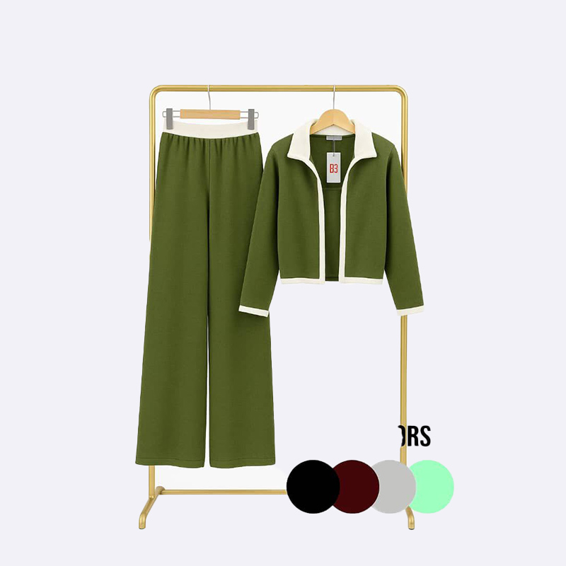 طقم شتوي محبوك ومريح للفتيات، يتكون من جاكيت قصير بسحاب وبنطال واسع بخصر مطاطي.