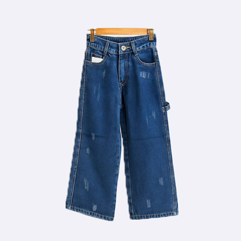 بنطال جينز عصري للفتيات بقَصة واسعة (Culottes) وخصر مرتفع، يتميز بتأثير التمزق الخفيف.