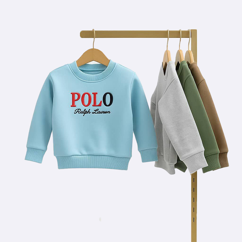 سويت شيرت شتوي دافئ ومريح للأطفال الصغار، يتميز بياقة دائرية وطبعة POLO بارزة على الصدر.