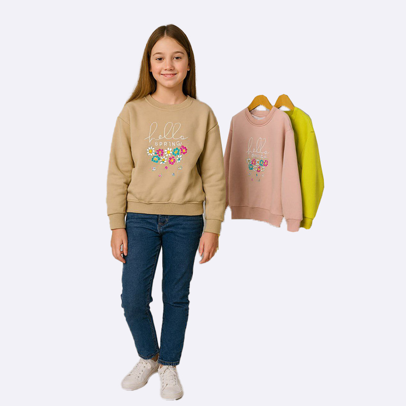 كنزة بناتي مريحة بقصة عملية وأكمام طويلة، مصنوعة من قماش ناعم مناسب للارتداء اليومي. مزينة بطبعة Hello Spring مع أزهار ملوّنة تعطيها طابعاً لطيفاً ومبهجاً، مثالية للمدرسة والخروجات اليومية.
