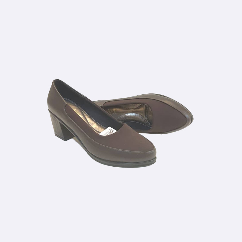 حذاء نسائي كلاسيكي باللون البني الغامق، يتميز بتصميم أنيق ومقدمة مدببة، وكعب عريض ونعل طبي مريح، يمنحك راحة وثباتًا طوال اليوم.