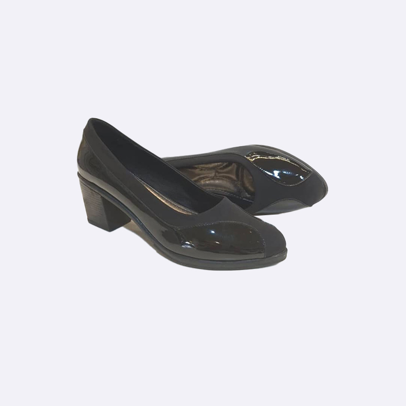 حذاء نسائي باللون الأسود اللامع، يتميز بتصميم أنيق ومقدمة مدببة، وكعب عريض ونعل طبي مريح، مناسب للاستخدام اليومي والعمل.