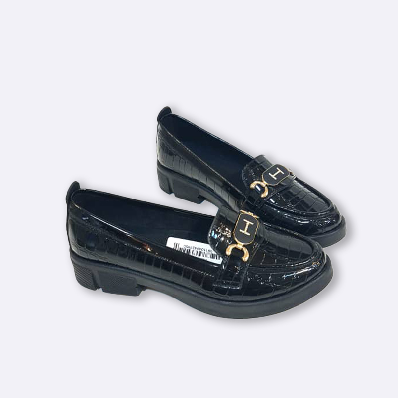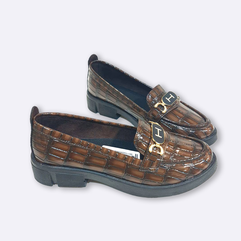 حذاء لوفر أنيق بنقشة التمساح بلون بني لامع، مزوّد بإبزيم معدني ذهبي يمنحك مظهراً راقياً. مناسب للاستخدام اليومي ومريح بفضل نعلته المتينة والعملية.
