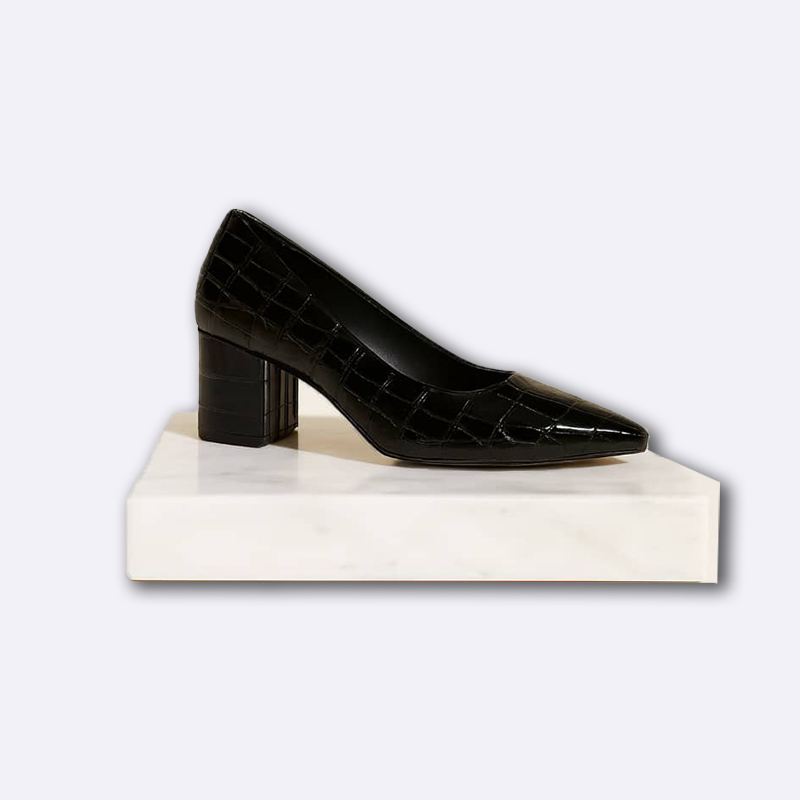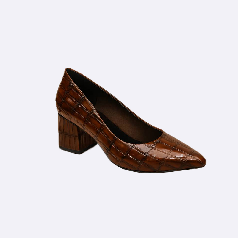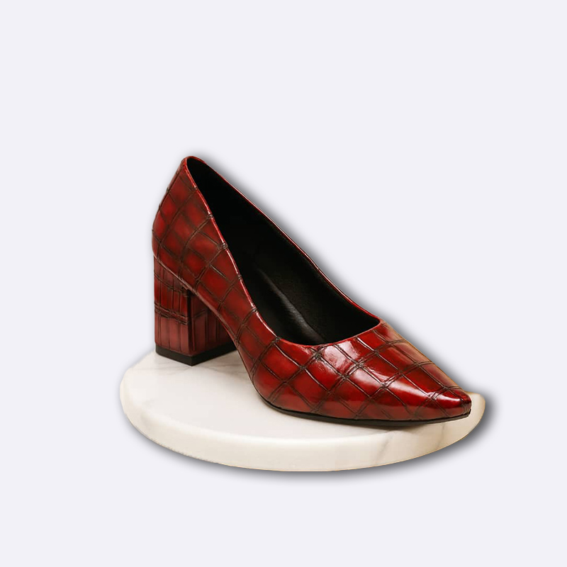 حذاء نسائي أنيق بتصميم كلاسيكي بنقشة جلد التمساح الراقية. يأتي بكعب عريض يوفر ثباتاً وراحة أثناء المشي، مع مقدمة مدببة تضيف لمسة فخامة وأناقة. مناسب للعمل، الإطلالات اليومية، والمناسبات الهادئة.