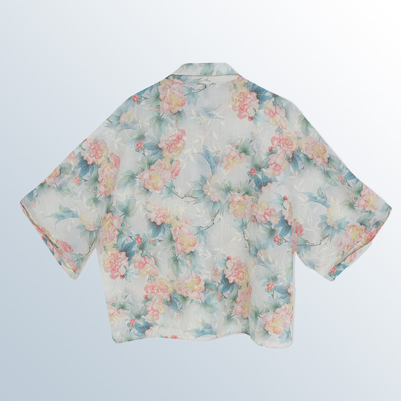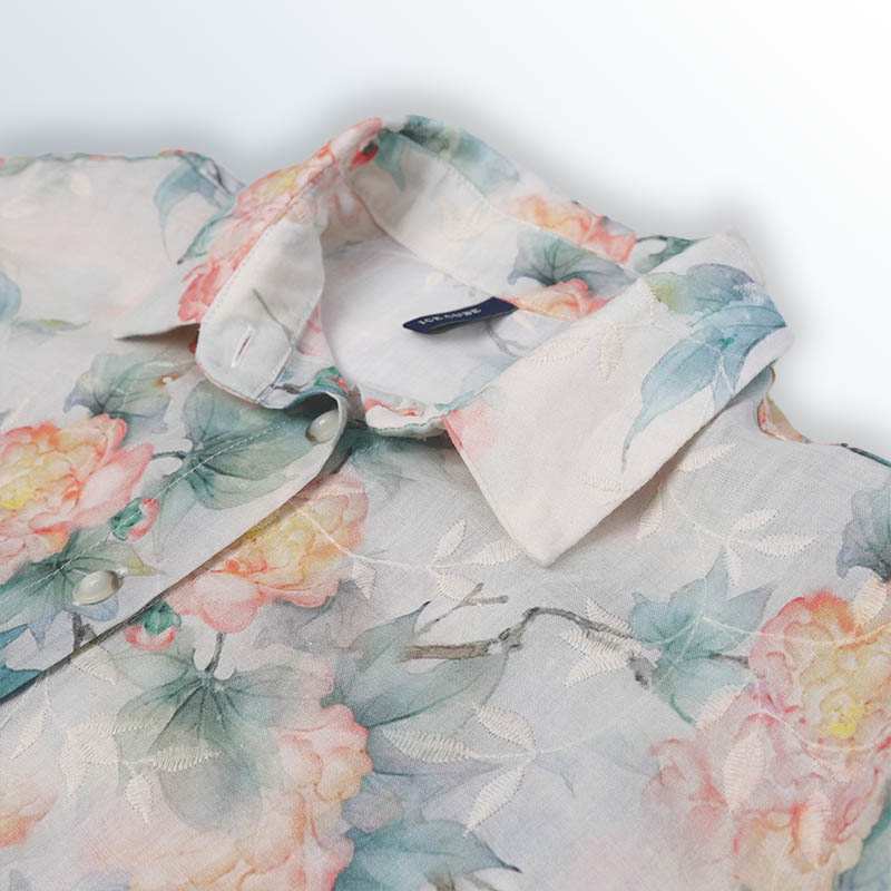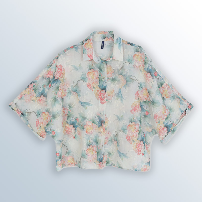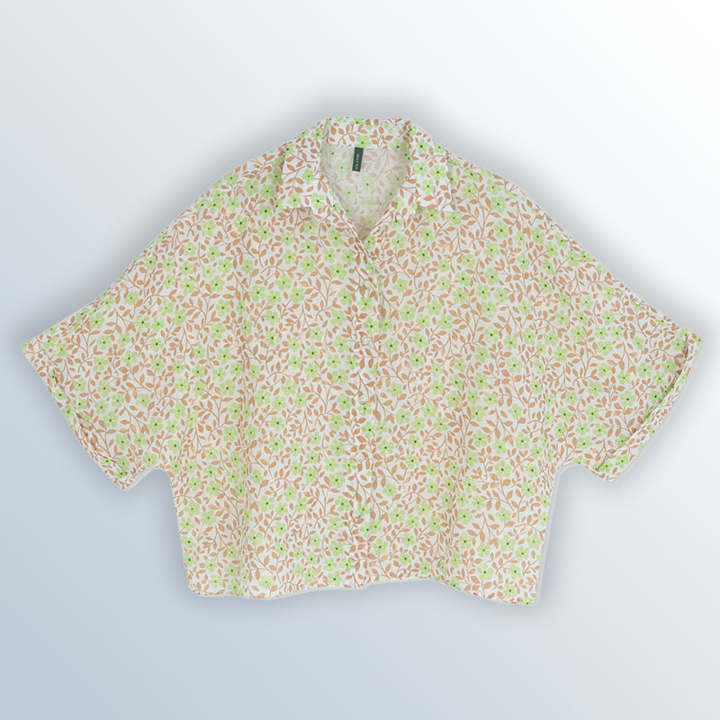 قميص نسائي أنيق 100% رايون، بلون أبيض بنقشة تفاحي أو أخضر. مريح وأنيق لإطلالة عصرية يومية أو شبه رسمية.