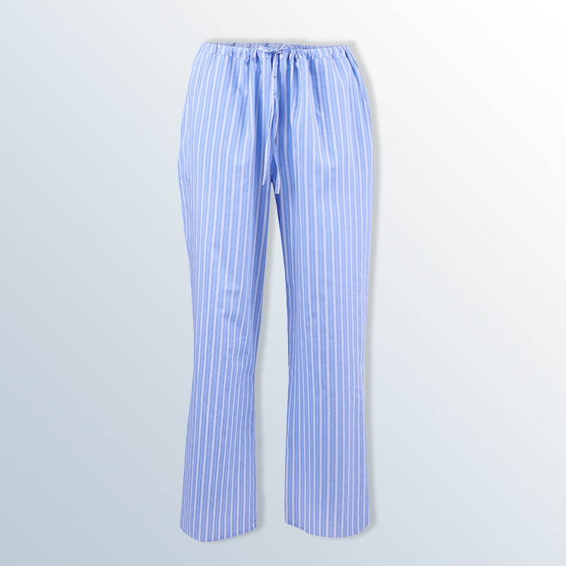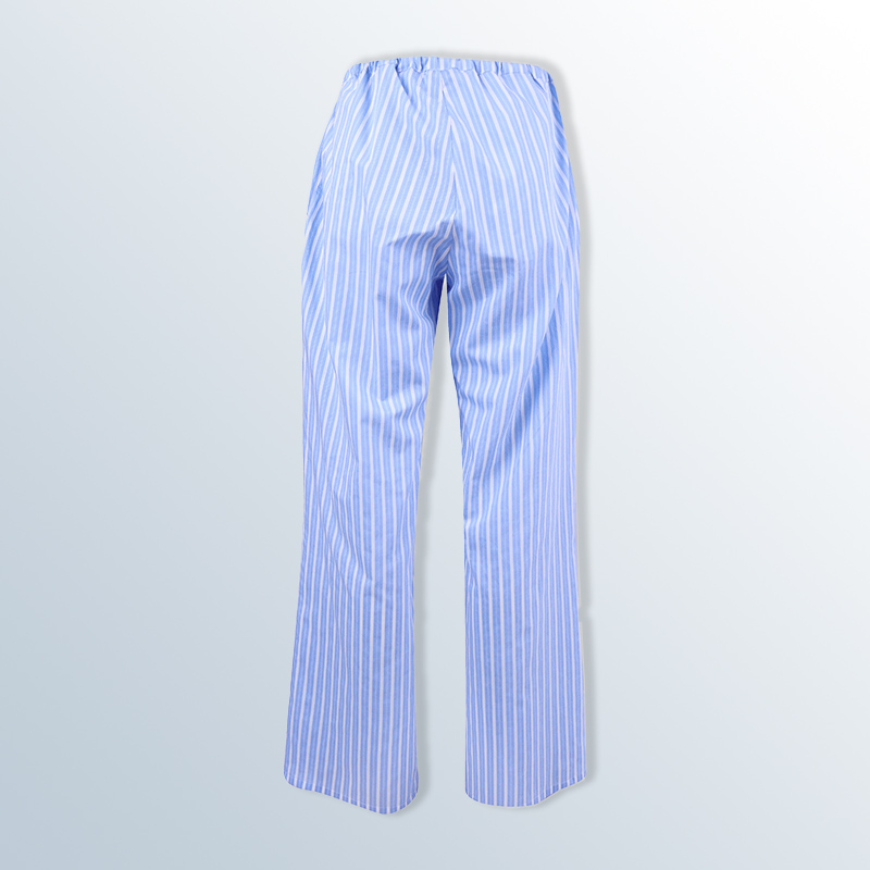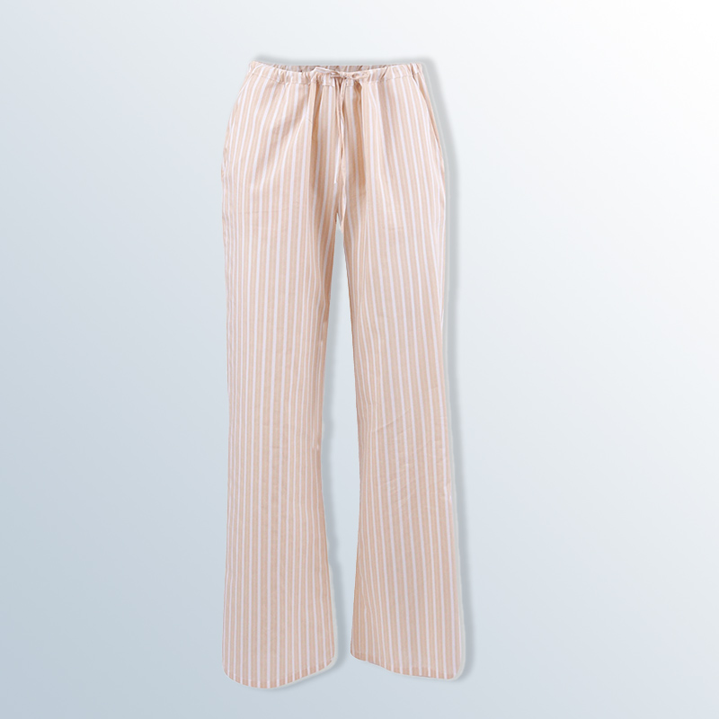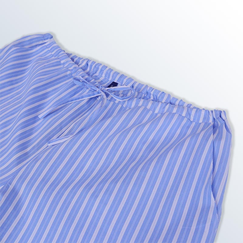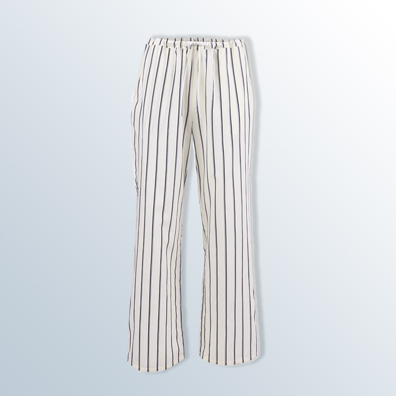 بنطال نسائي مخطط برباط خصر أنيق، بألوان الأزرق، الأوف وايت، والبيج. تصميم عصري ومريح مصنوع من مزيج ناعم من القطن واللايوسل والنايلون، مثالي للإطلالات اليومية أو التنسيق مع قطع رسمية وعصرية.