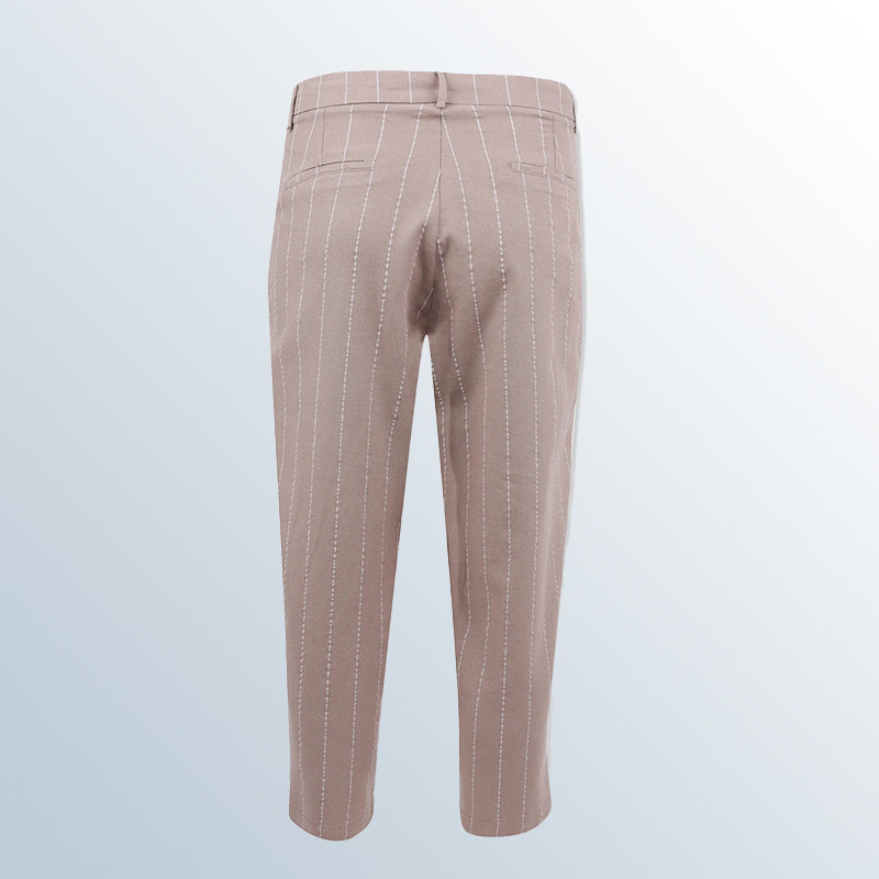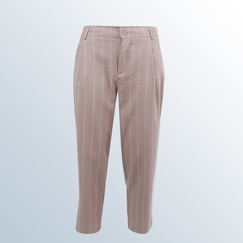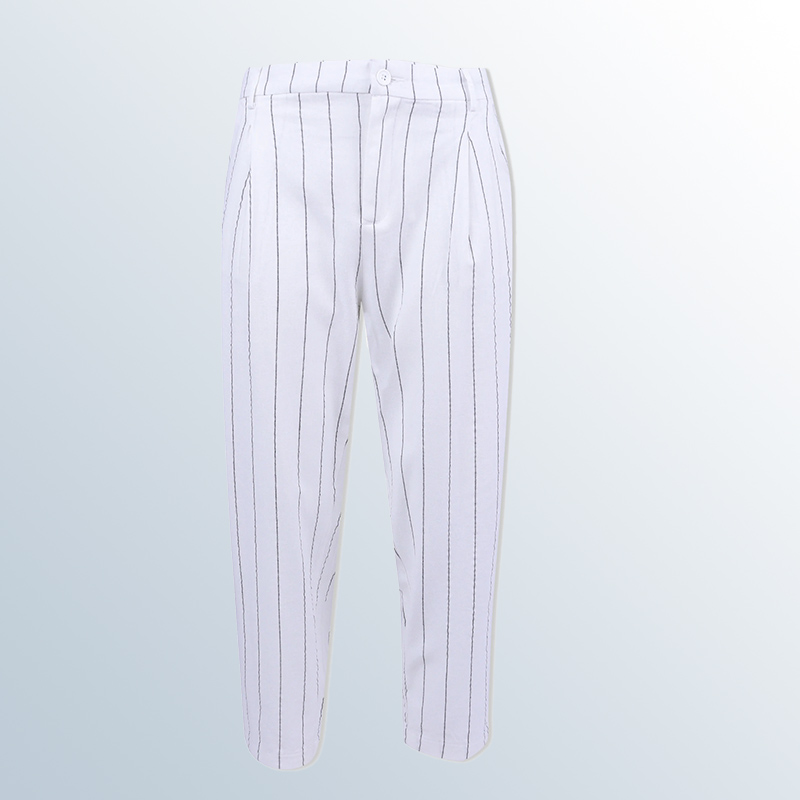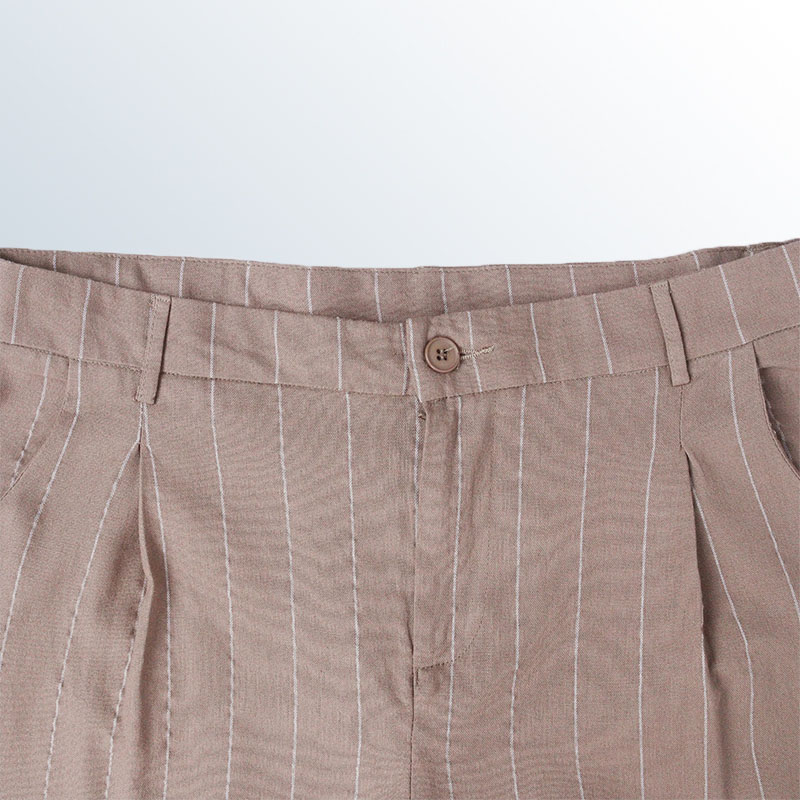 بنطال نسائي مخطط بقصّة مدروسة تضيق نحو الأسفل، مصنوع من مزيج 55? كتان و45? رايون. تصميم أنيق بطيّات أمامية وخصر مطاطي من الخلف. متوفر بلونين: أبيض مخطط وبيج مخطط، مثالي للإطلالات العصرية.