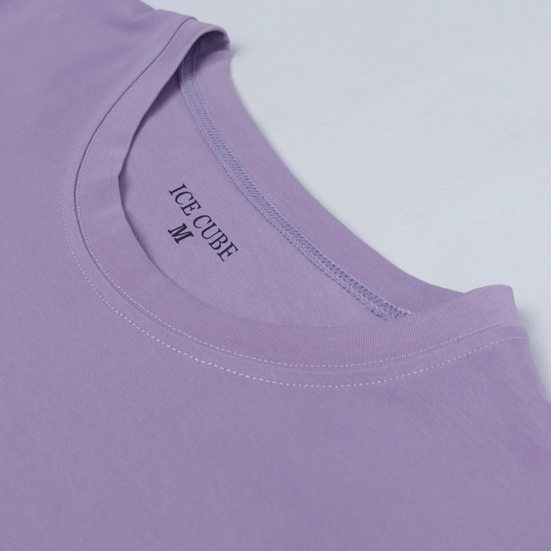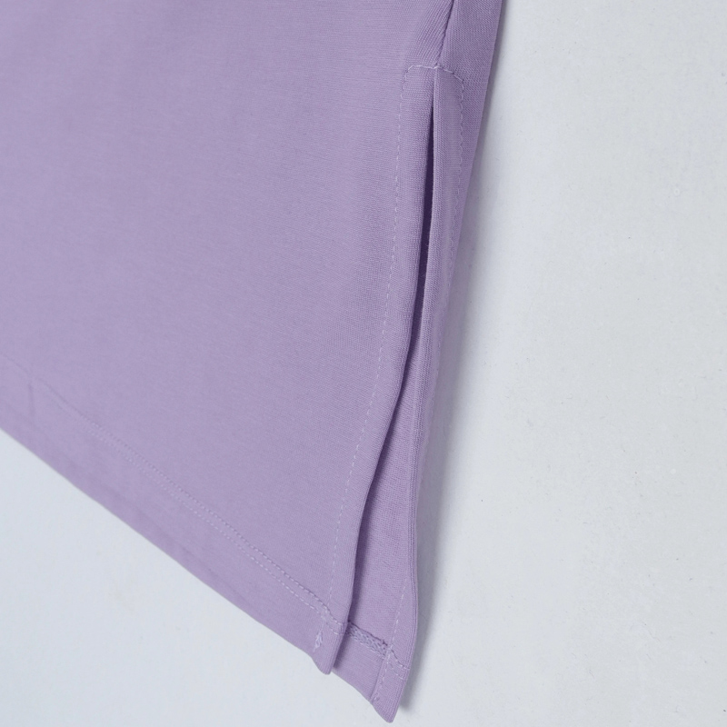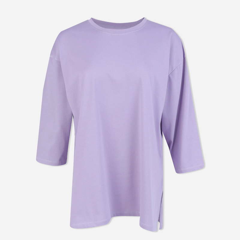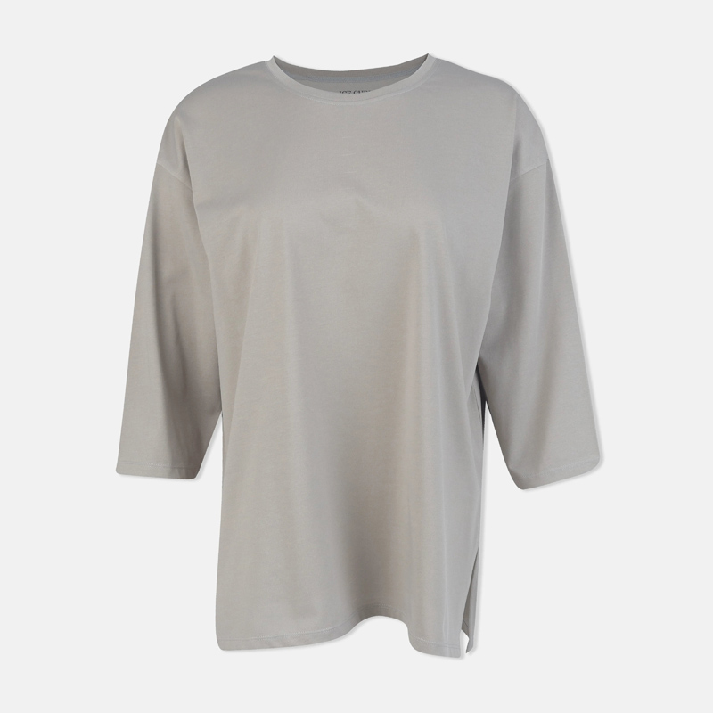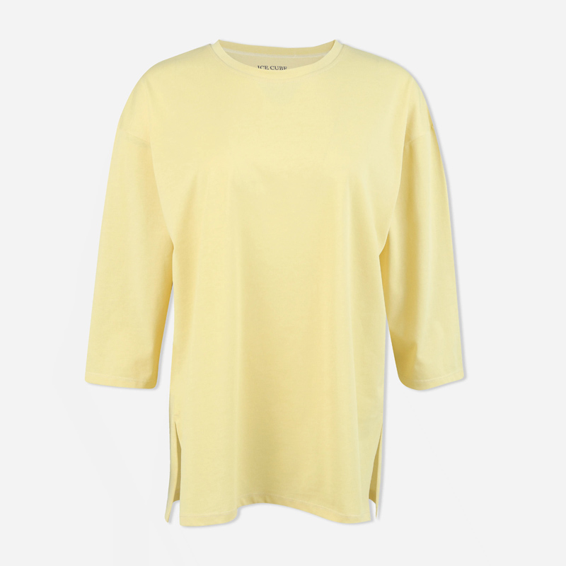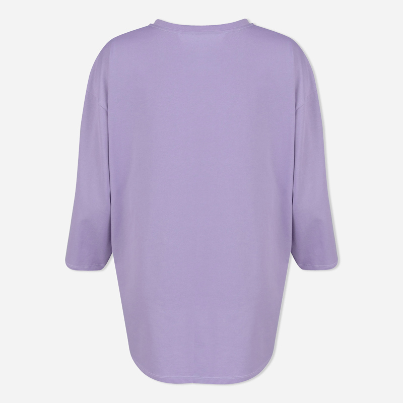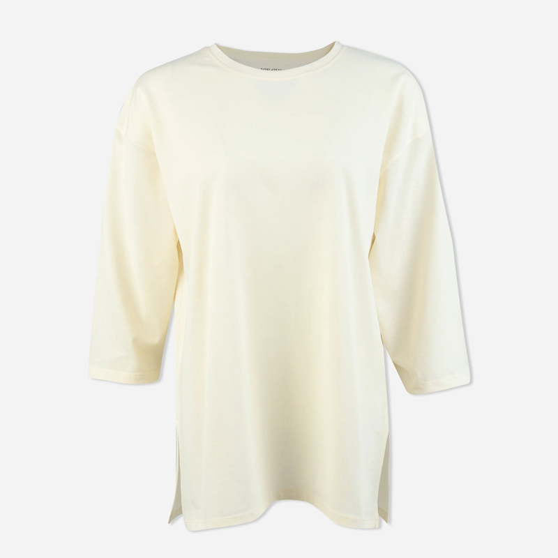 تيشيرت نسائي بأكمام طويلة بألوان ناعمة: العاجي، البنفسجي، الأصفر الفاتح، والرمادي. مصنوع من مزيج من القطن والألياف اللدنة (65% قطن، 35% fty).