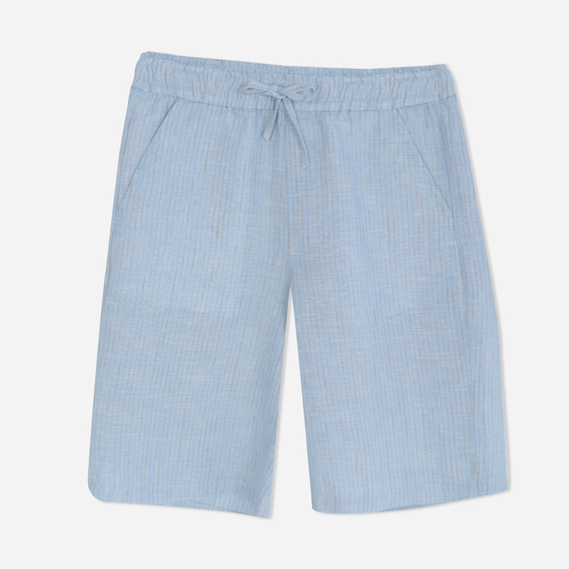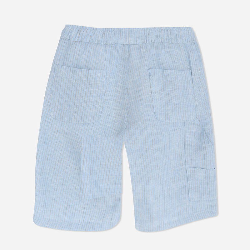 شورت أولادي مخطط أنيق بلون رمادي مخطط أبيض وسماوي مخطط رمادي. مصنوع من 100% كتان ناعم وخفيف، مثالي لأيام الصيف الحارة. تصميم مريح وأنيق يمنح طفلك حرية الحركة.