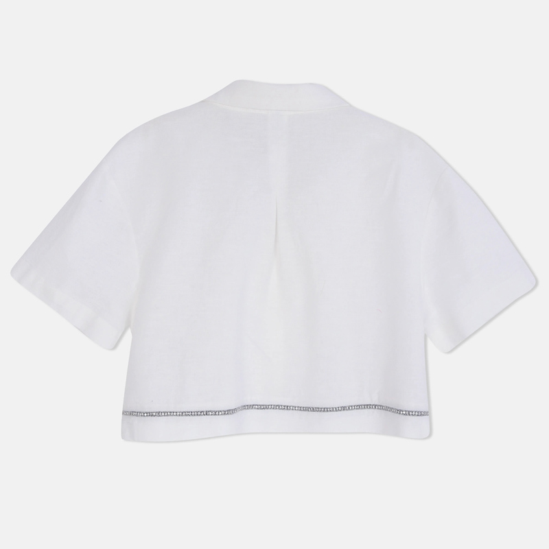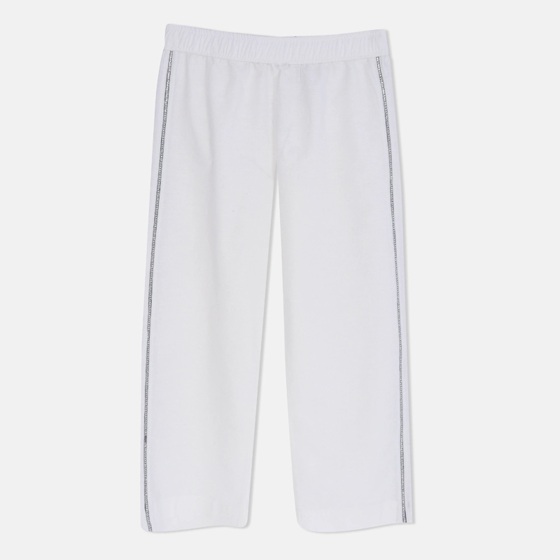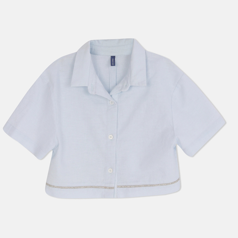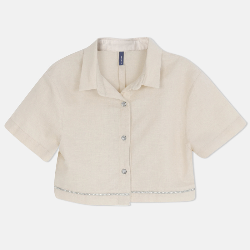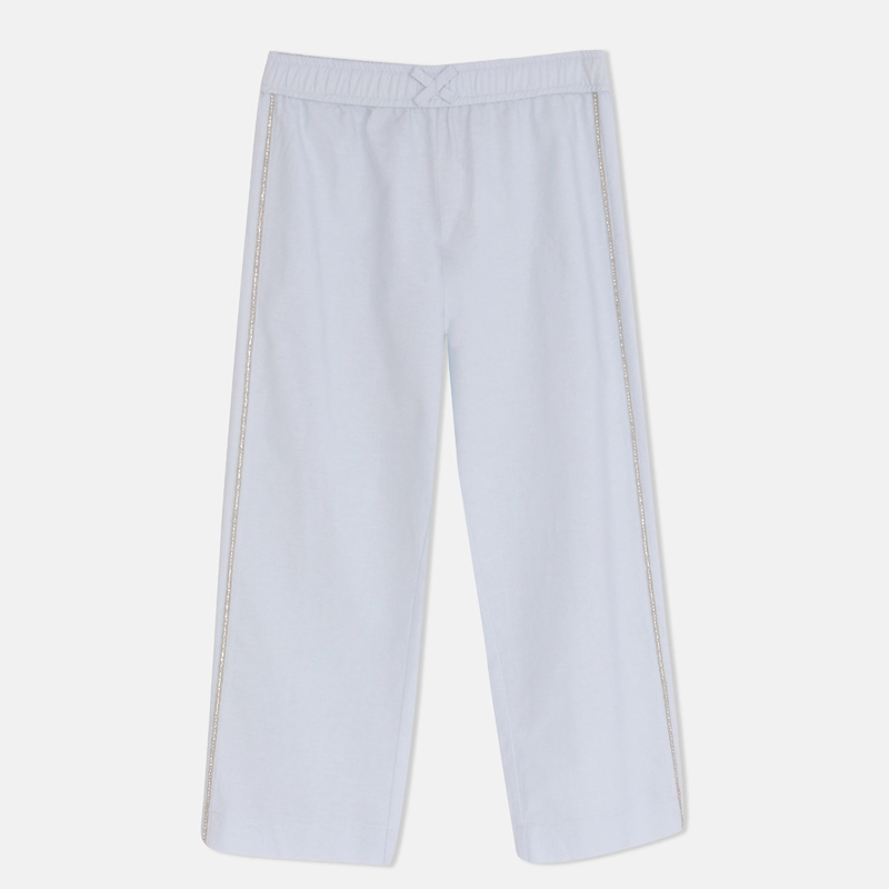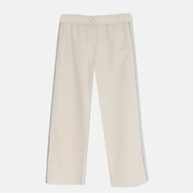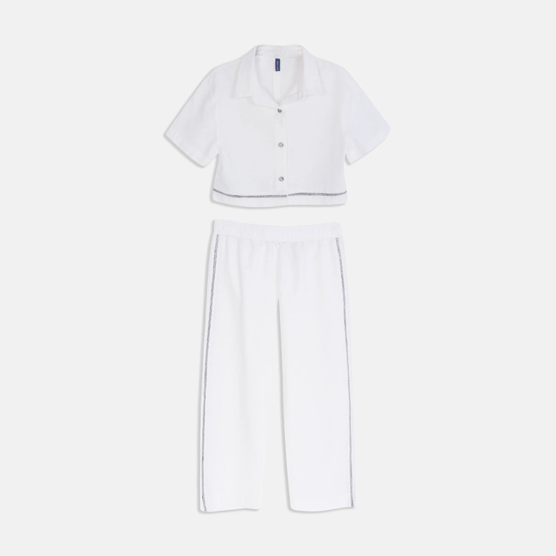 طقم بناتي أنيق بألوان أزرق فاتح، بيج، وأبيض. مصنوع من مزيج 55% كتان و45% قطن، مريح ومناسب لأجواء الصيف. مثالي للنزهات والمناسبات