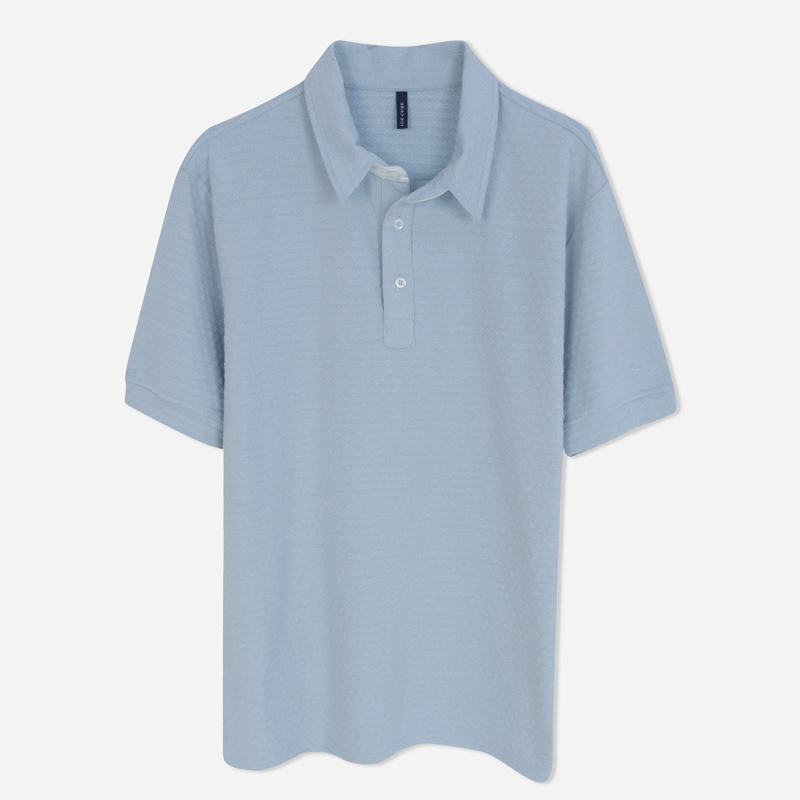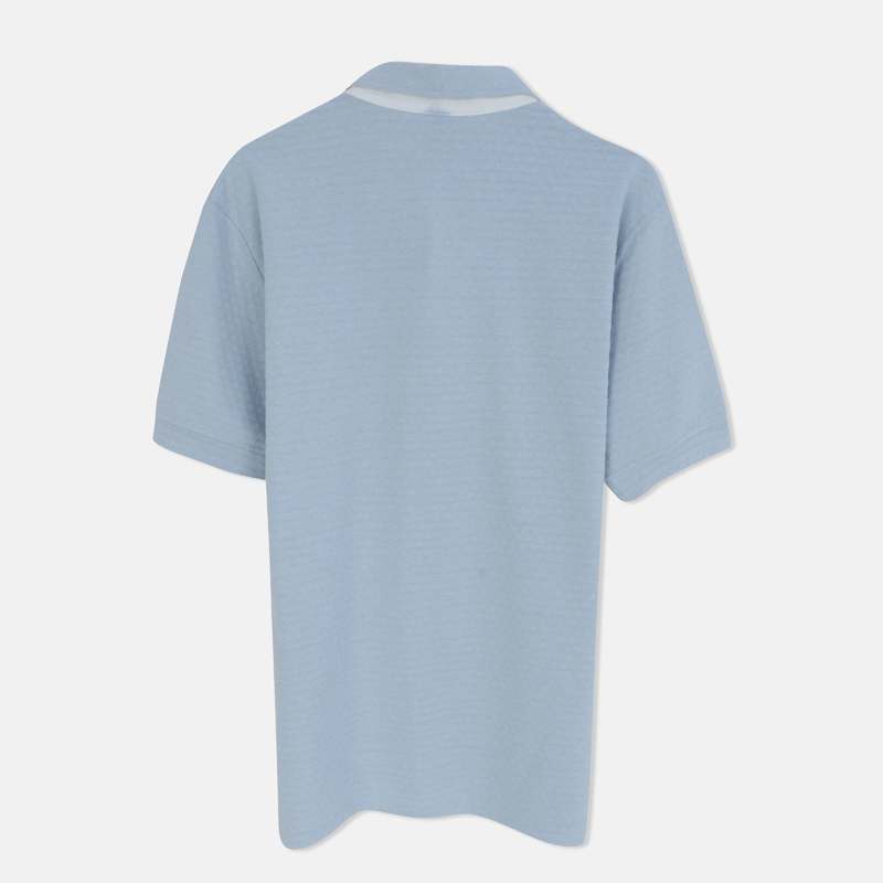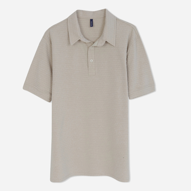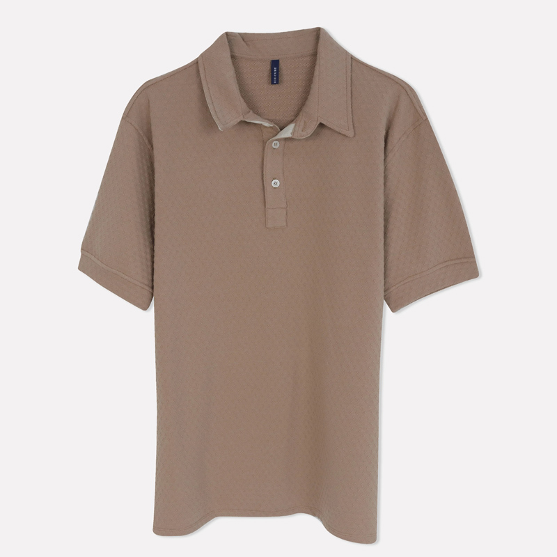 تيشيرت رجالي ناعم وأنيق باللون البني والأزرق والبيج. مصنوع من مزيج فاخر: T1 (بوليستر 61%، قطن 33%، سباندكس 6%) وT2 (قطن 55%، تينسل 6%) لضمان الراحة والمتانة