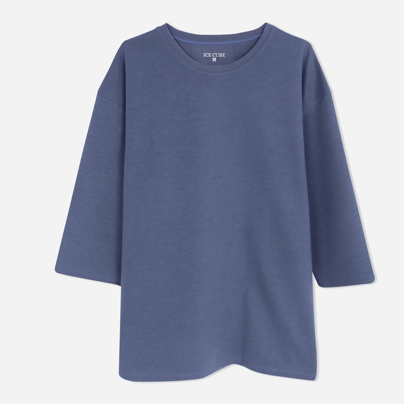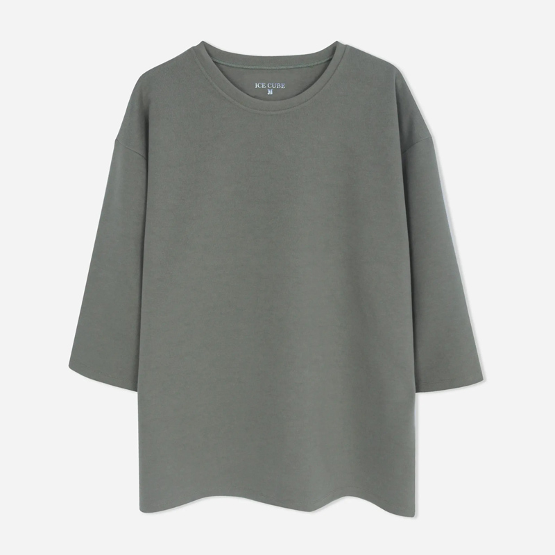 تيشيرت نسائي بأكمام ¾ بألوان البيج، الرمادي، البترولي، والعفني. مصنوع من مزيج ناعم 65% بوليستر و35% قطن،