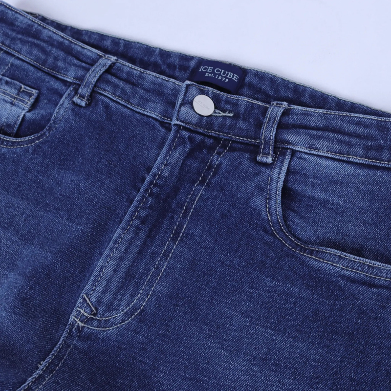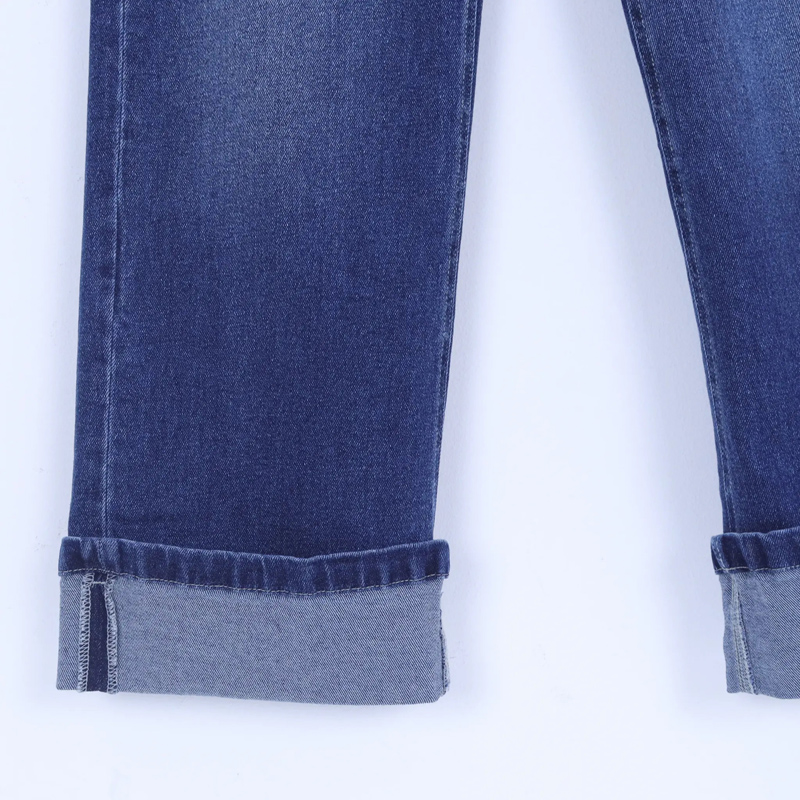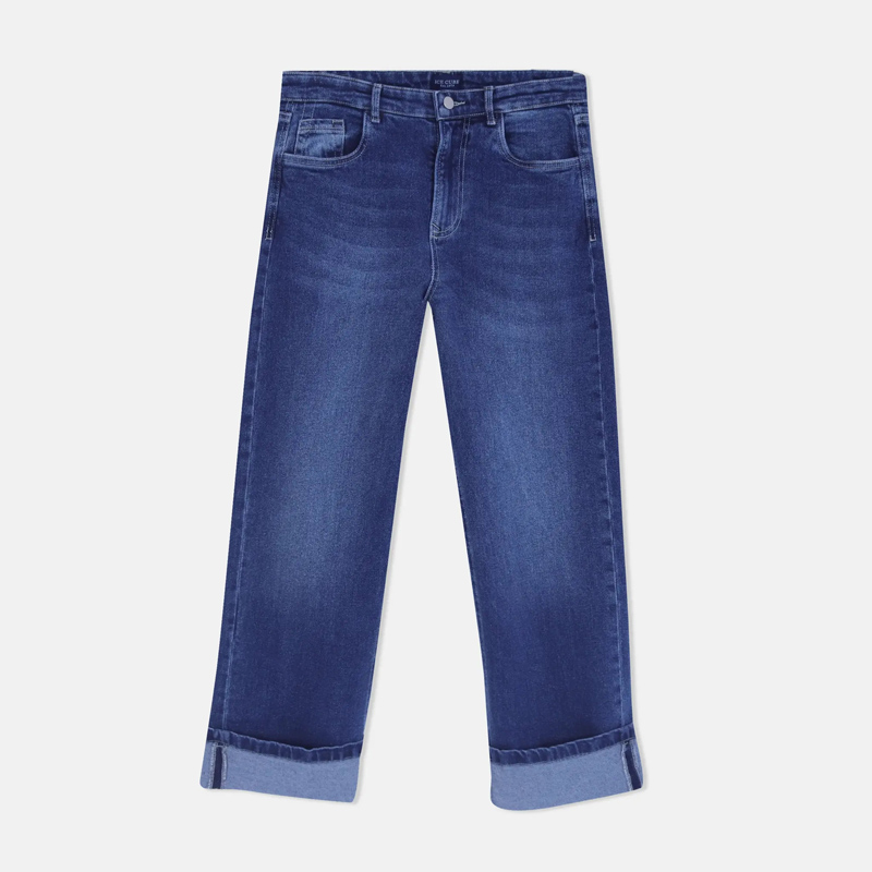 جينز نسائي عالي الخصر بقصة مستقيمة وحاشية مكفّه. مصنوع من 99? قطن و1? إيلاستين لراحة لا مثيل لها