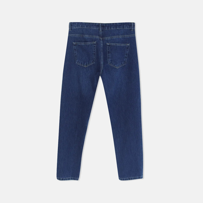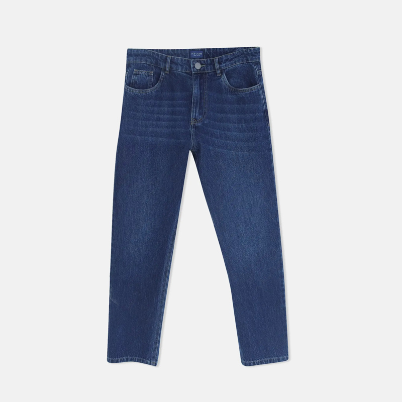 بنطال جينز رجالي كلاسيكي عصري من الدنيم الأزرق الغامق. مصنوع من قطن خالص (99%) مع إضافة 1% إيلاستين