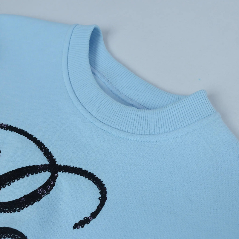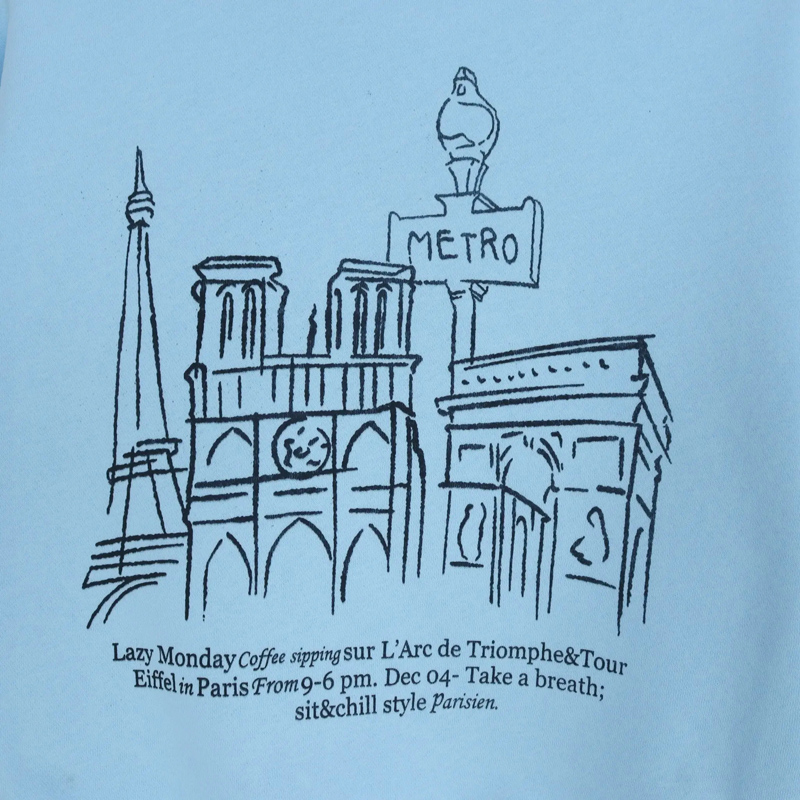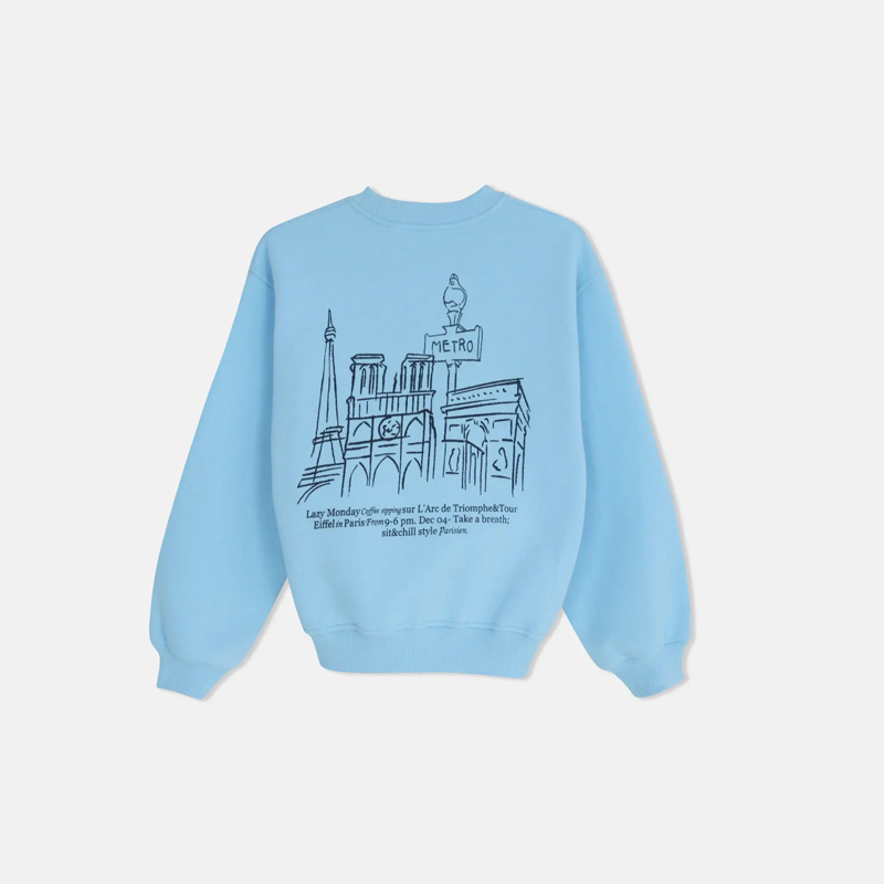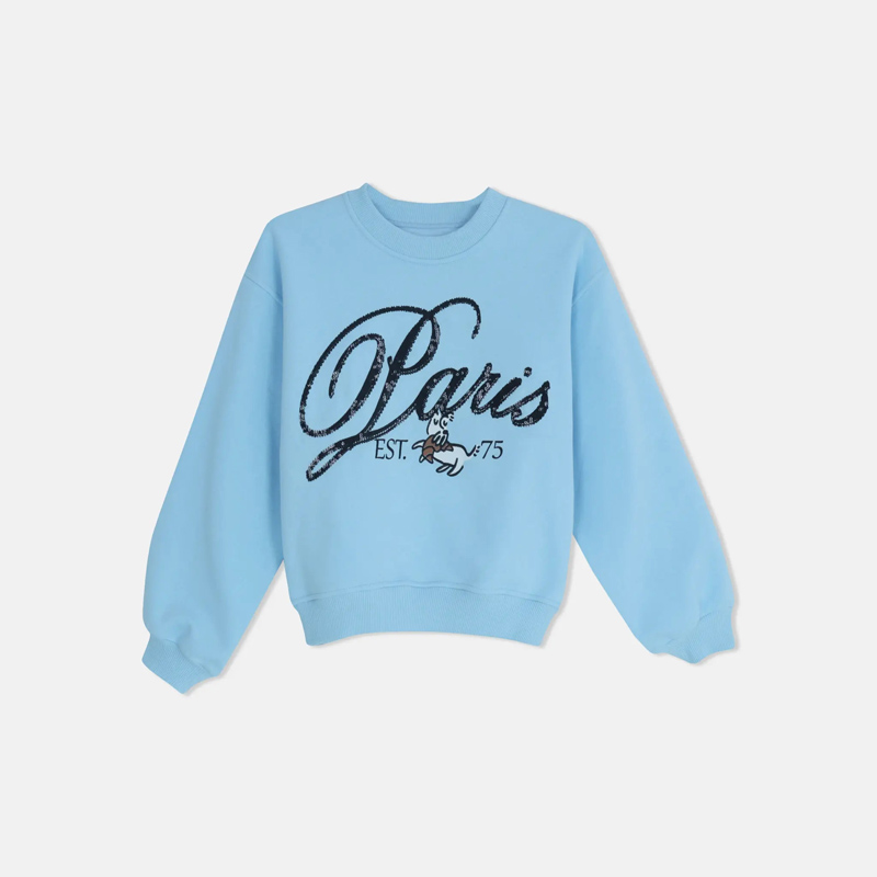 أضيفي لمسة عصرية وأنيقة إلى خزانة ملابس صغيرتك مع هذا السويتر باللون السماوي وطبعة "باريس". مصنوع من مزيج ناعم ومريح من القطن والسباندكس