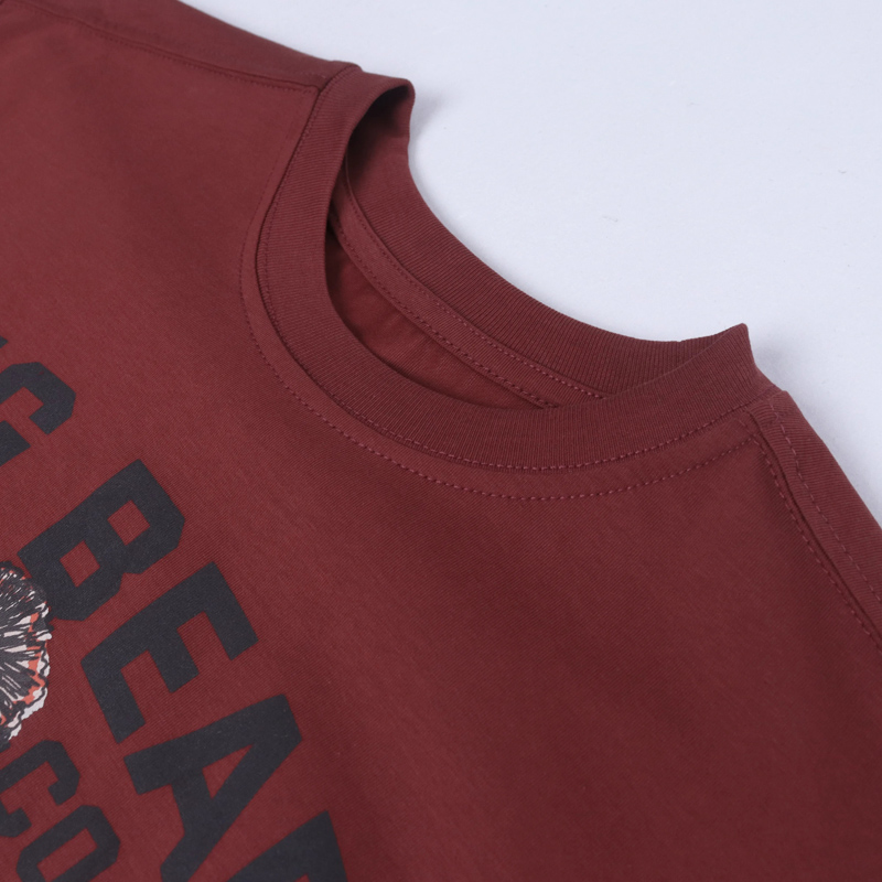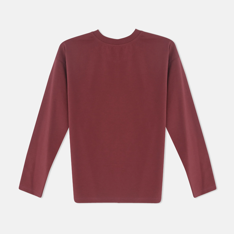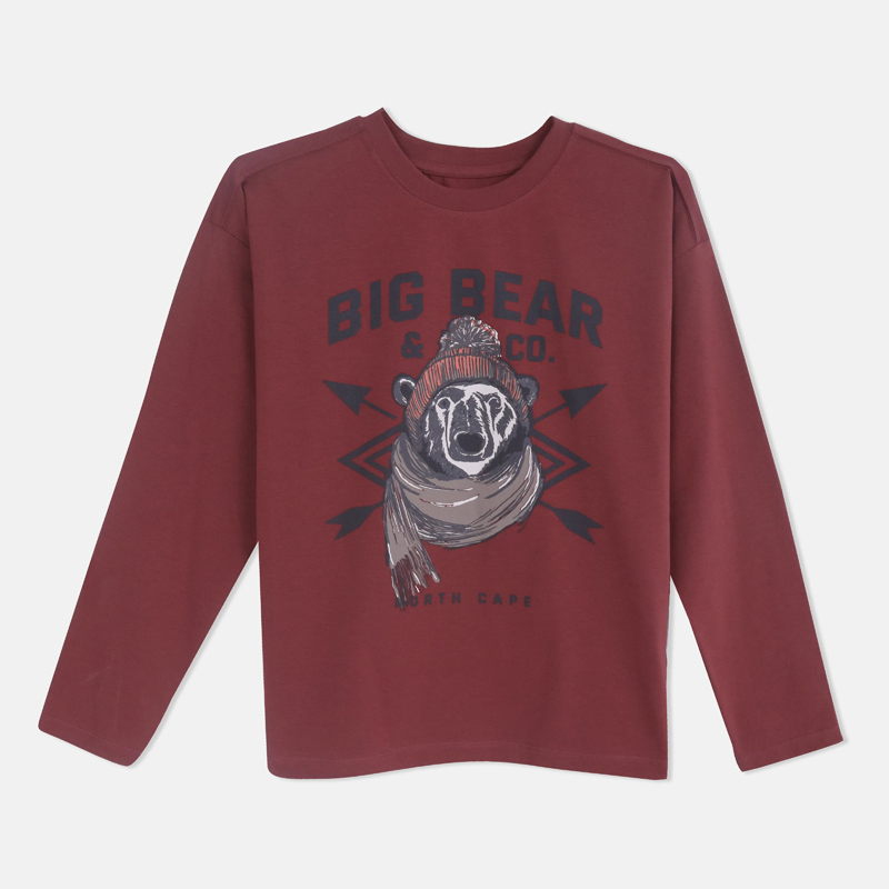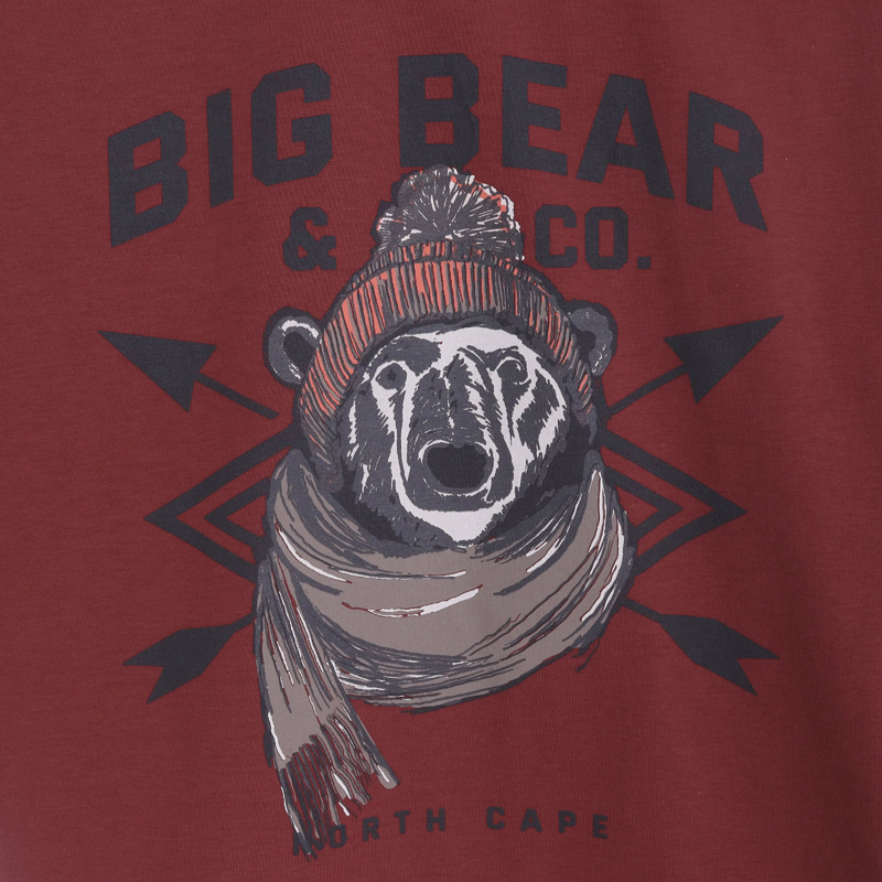 كنزة ولادي بأكمام طويلة وطبعة. هذه الكنزة العصرية باللون الخمري تتميز بطبعة "BIG BEAR & CO." وقماش مريح من مزيج القطن-سباندكس (73% قطن، 27% سباندكس).