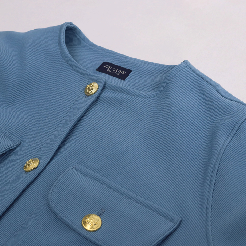 جاكيت نسائي بألوان رائعة (أزرق، عسلي، ونهد) مصنوع من مزيج مميز من 96.5% بوليستر و3.5% سباندكس. يتميز بالراحة والمرونة، مما يجعله خياراً مثالياً لإطلالة أنيقة وعصرية في مختلف المناسبات.
