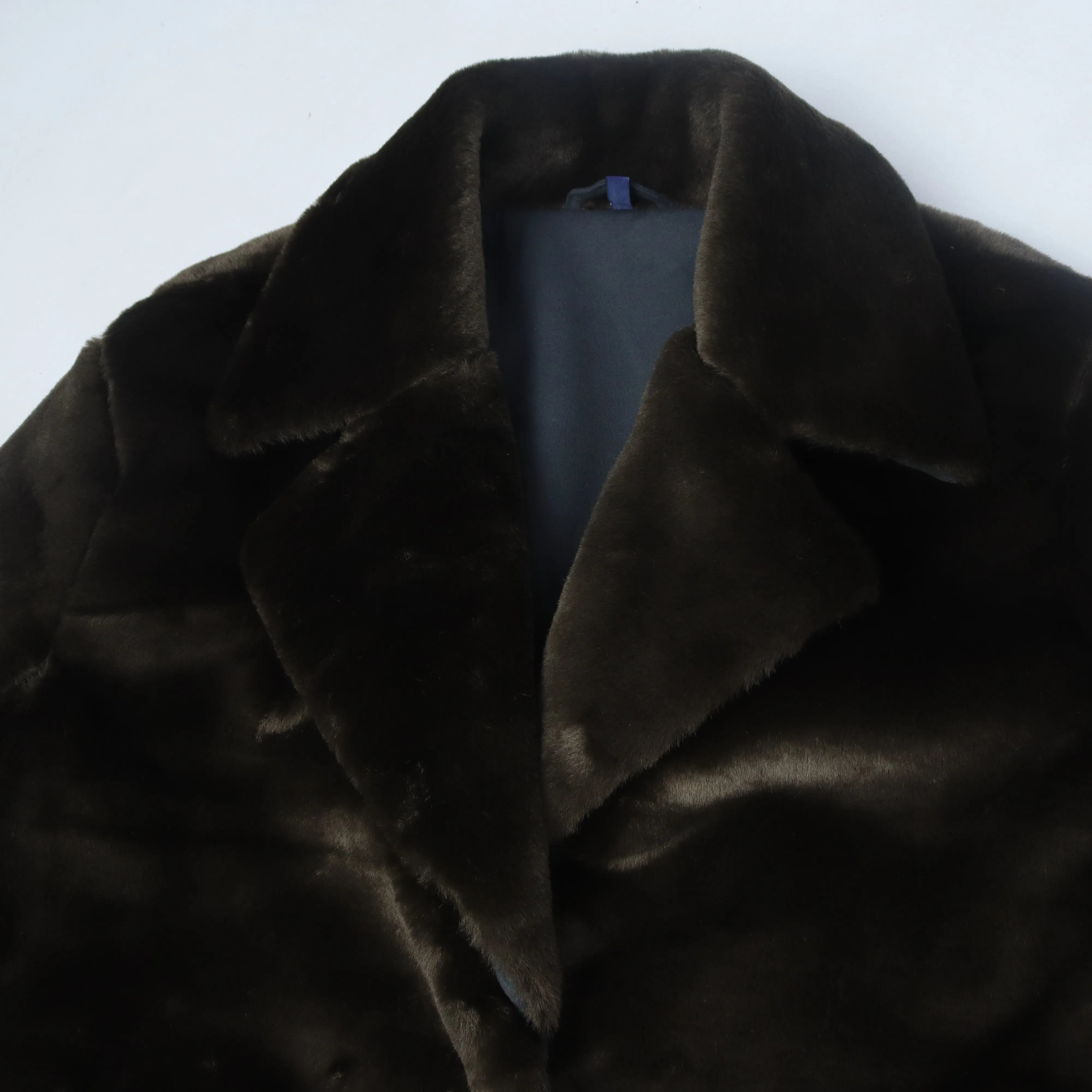 جاكيت فرو صناعي أنيق بلون بني غامق، مصنوع بالكامل من بوليستر عالي الجودة لملمس ناعم ودفء مثالي في الأيام الباردة.