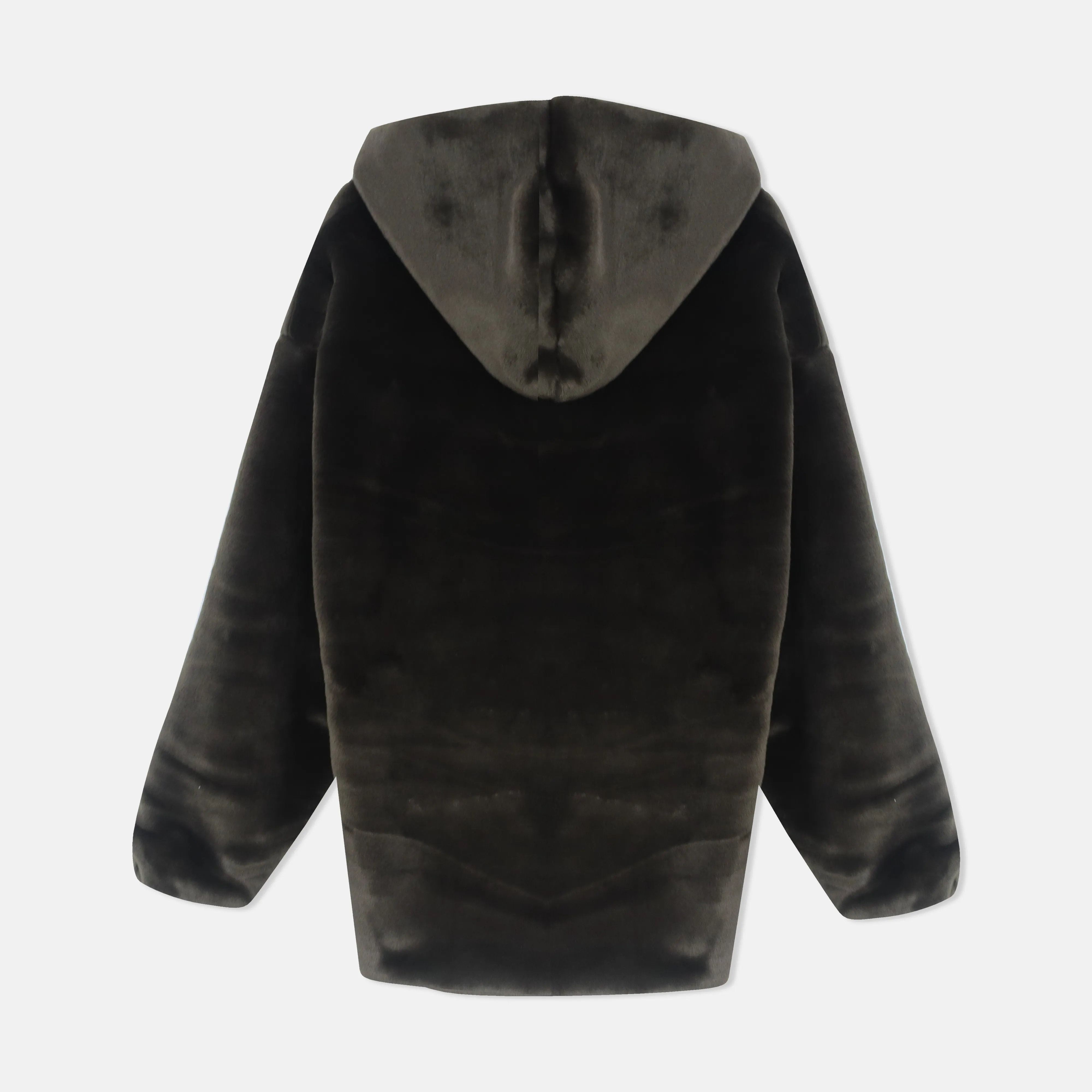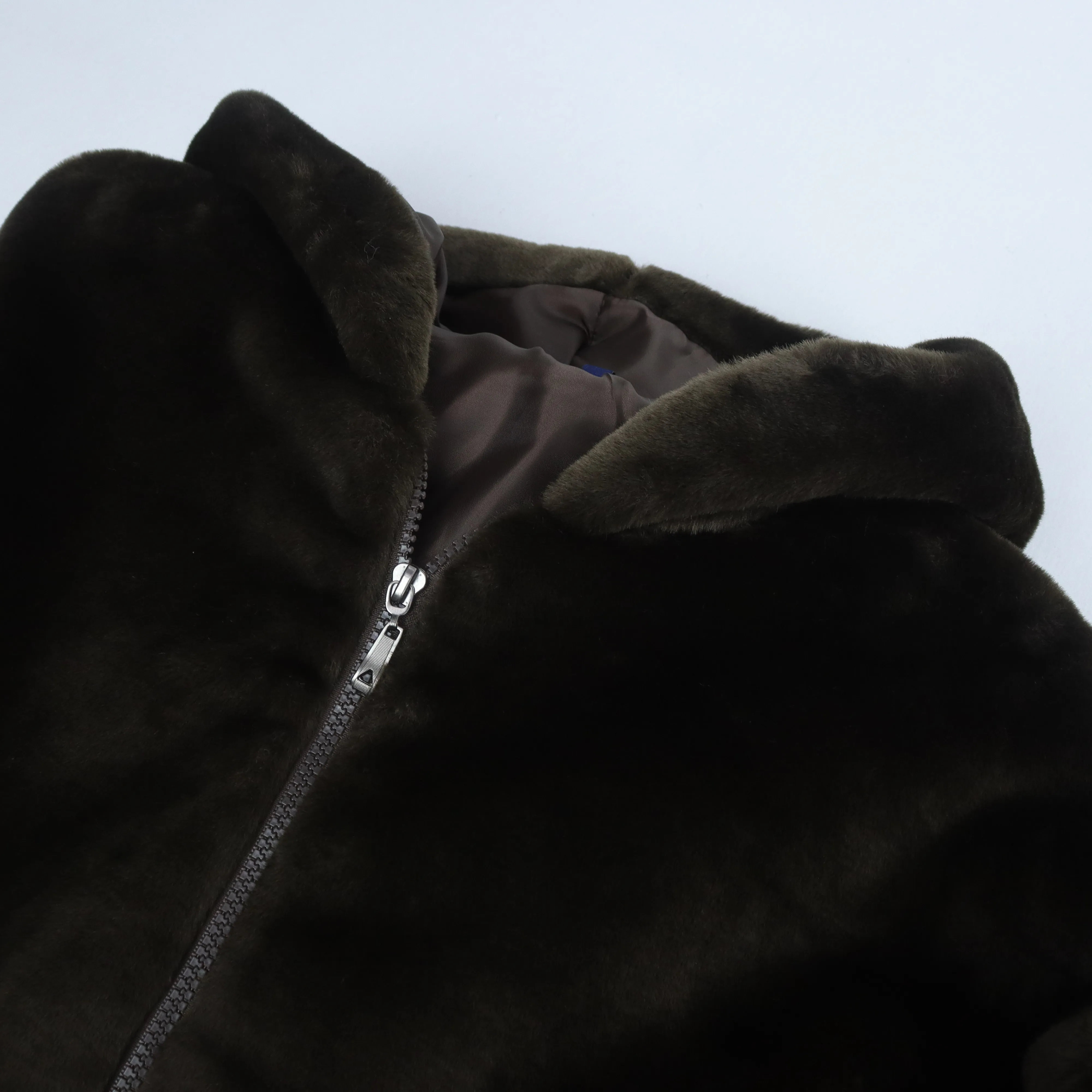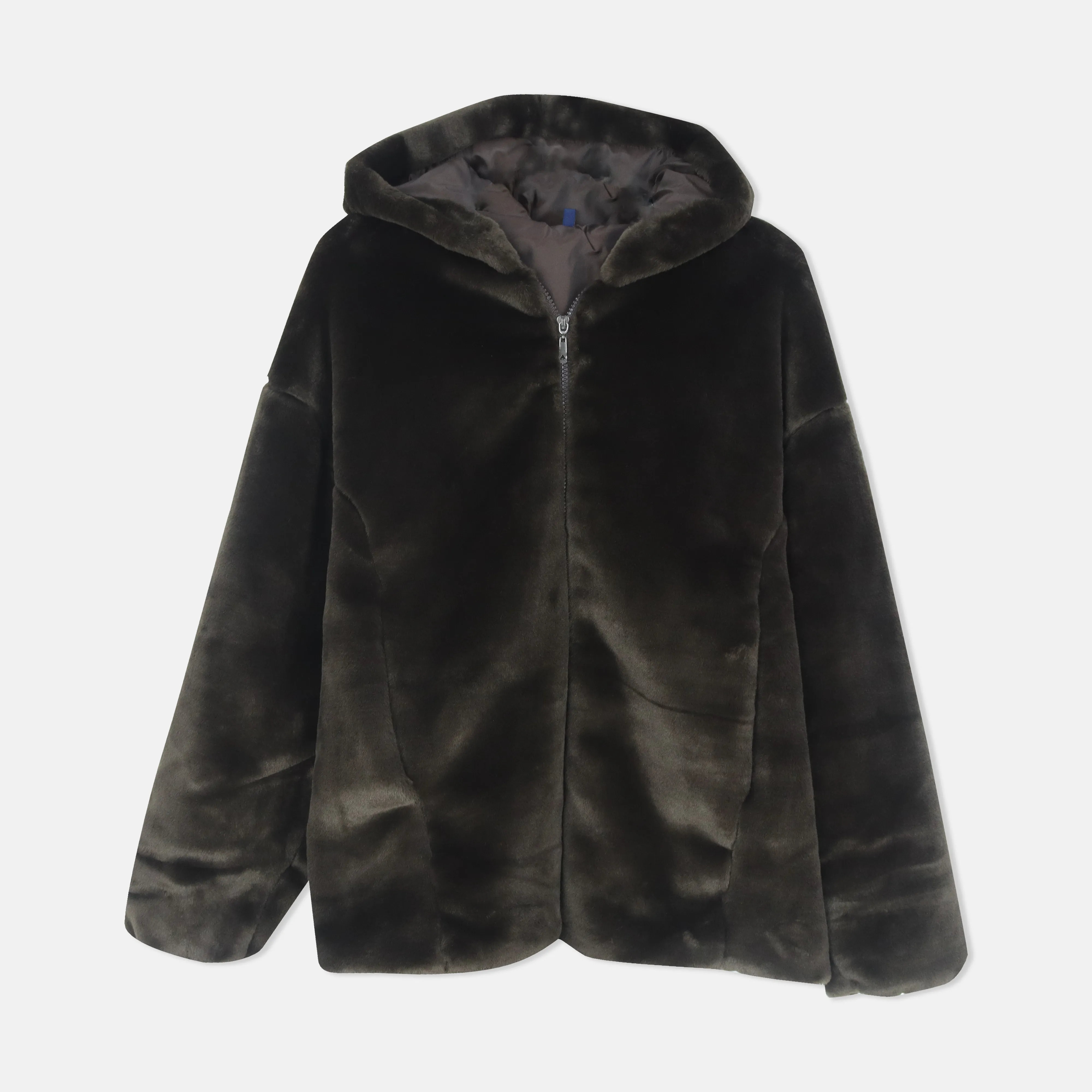 جاكيت نسائي بغطاء رأس مبطّن بفرو صناعي، بلون بني غامق أنيق. تصميم دافئ وعصري مثالي لأيام الشتاء الباردة. مصنوع بالكامل من بوليستر عالي الجودة لراحة وحماية تدوم طويلًا.