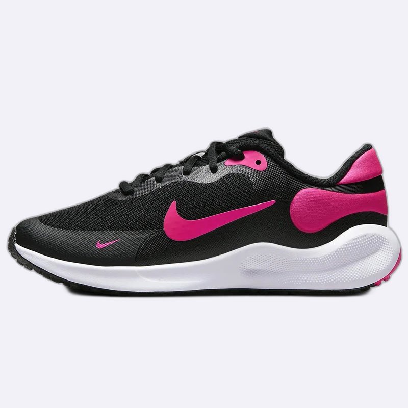 حذاء نايك ريفولوشن 7 للأطفال الكبار، تصميم مريح وخفيف للمدرسة أو الرياضة. نعل مرن وتهوية مثالية للحركة اليومية. متوفر باللونين الأسود والأبيض.