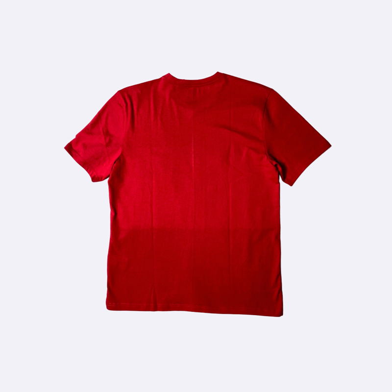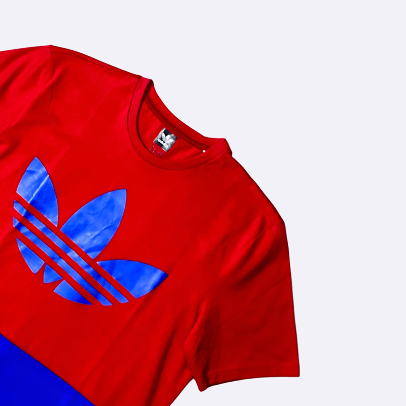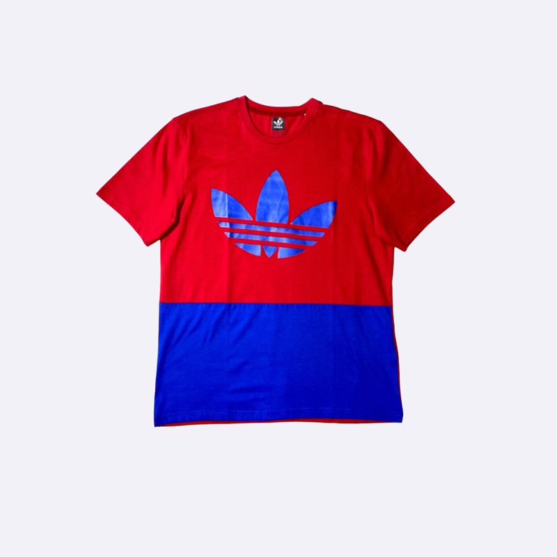 تي شيرت رجالي من أديداس بتصميم عصري وجريء، مقسوم إلى قسمين: العلوي باللون الأحمر، والسفلي باللون الأزرق. شعار "تريفويل" الشهير لأديداس باللون الأزرق. التي شيرت مصنوع من قماش مريح ومناسب للارتداء اليومي