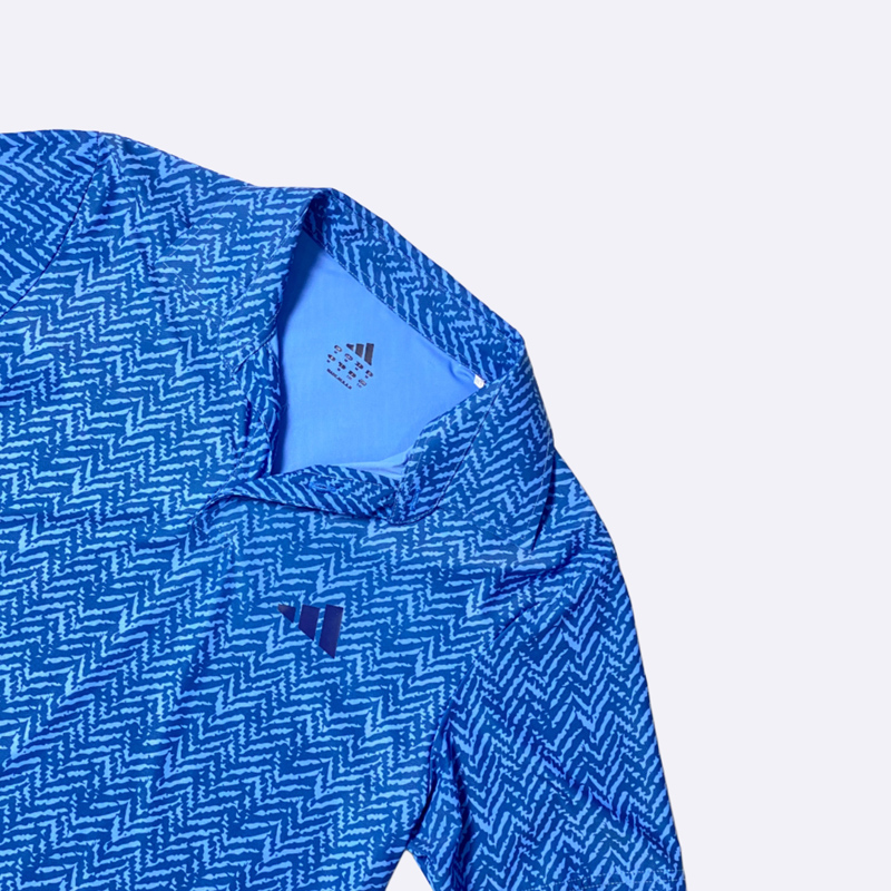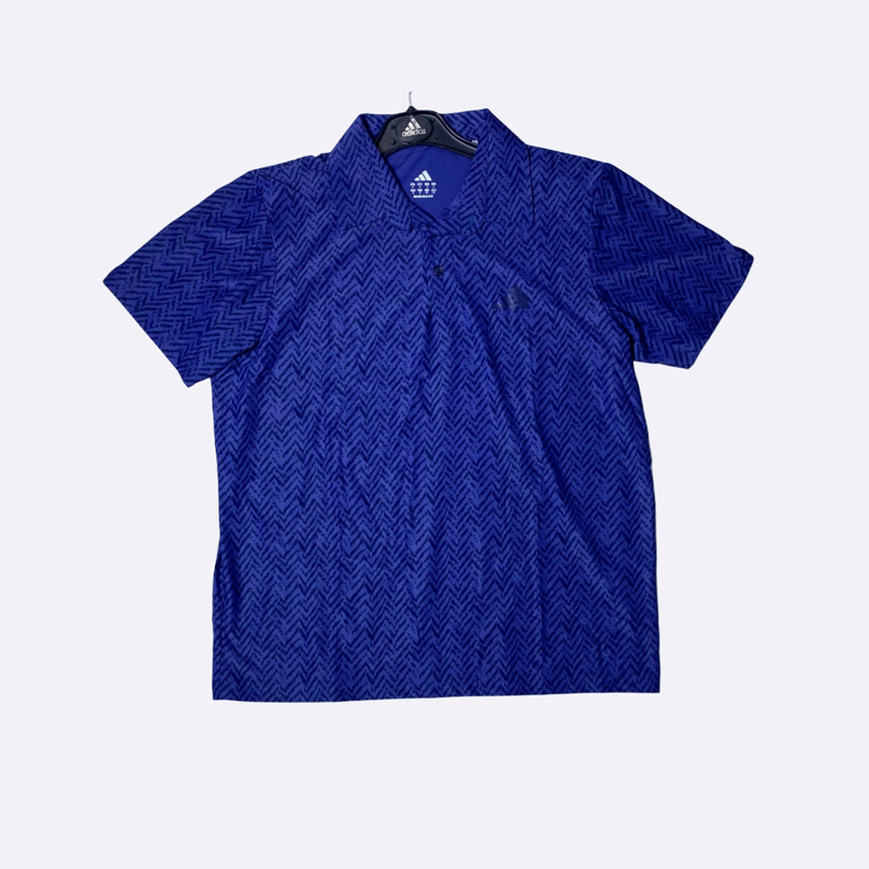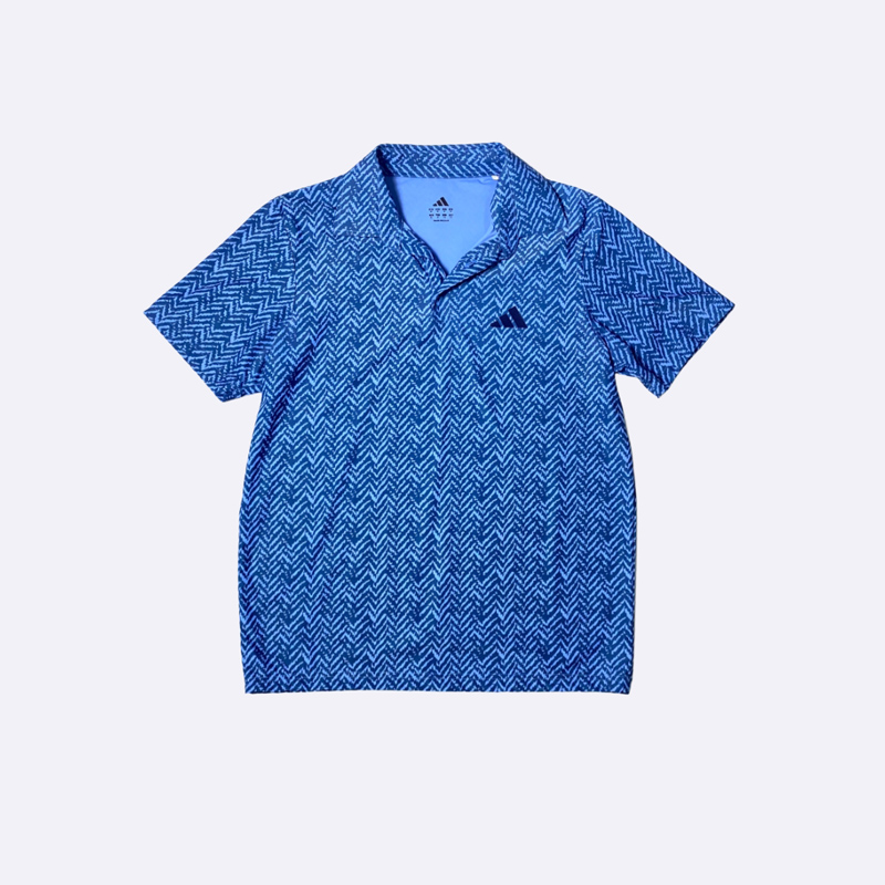 بولو شيرت رياضي رجالي بتصميم عملي ومريح. يتميز بياقة كلاسيكية وأزرار عند الرقبة، مع طبعة هندسية صغيرة تغطي القميص بالكامل. يبرز شعار أديداس الشهير على الكم الأيسر. هذا القميص مثالي للأنشطة الرياضية