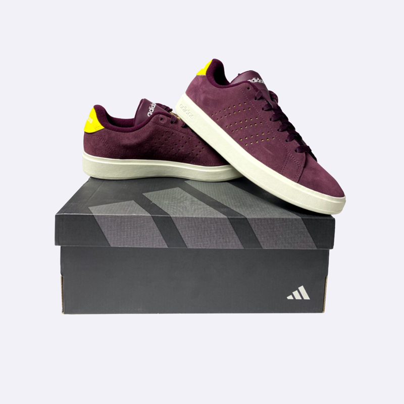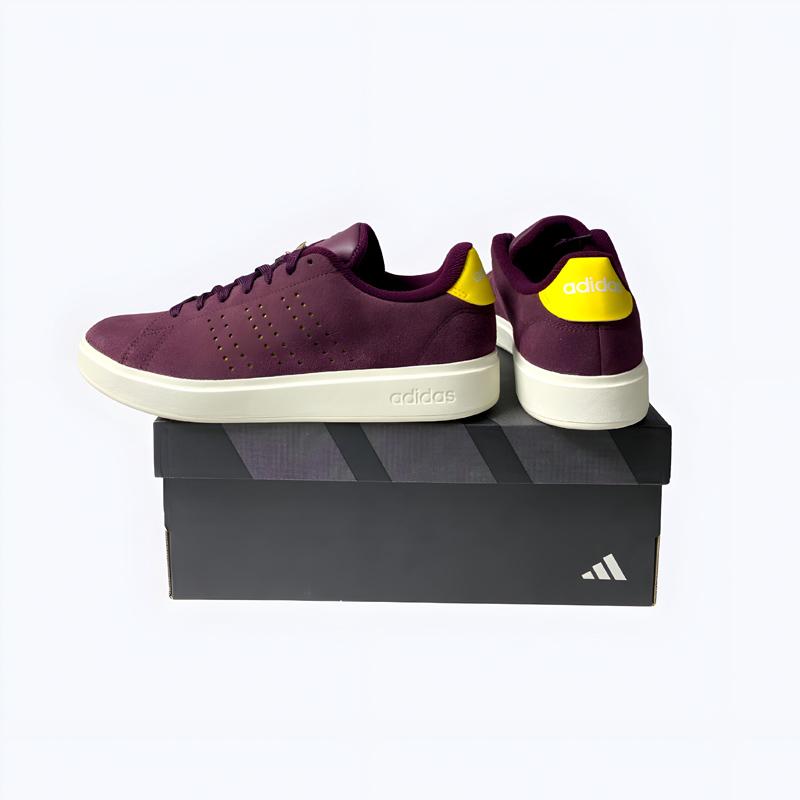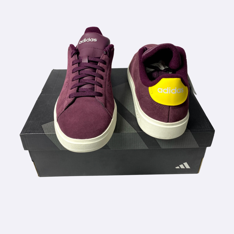 حذاء رجالي كاجوال من أديداس بتصميم أنيق ومريح. يتميز الحذاء بلون العنابي الداكن مع خطوط جانبية وثلاثة خطوط أيقونية باللون الأصفر. كما يبرز شعار أديداس على الكعب. الحذاء مزود بنعل سميك باللون الأبيض