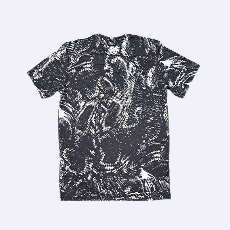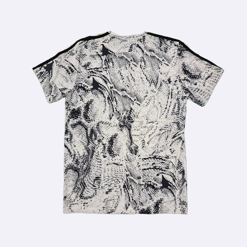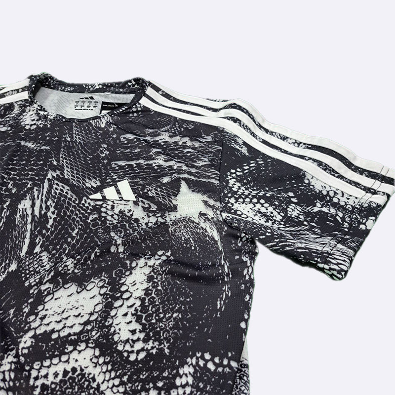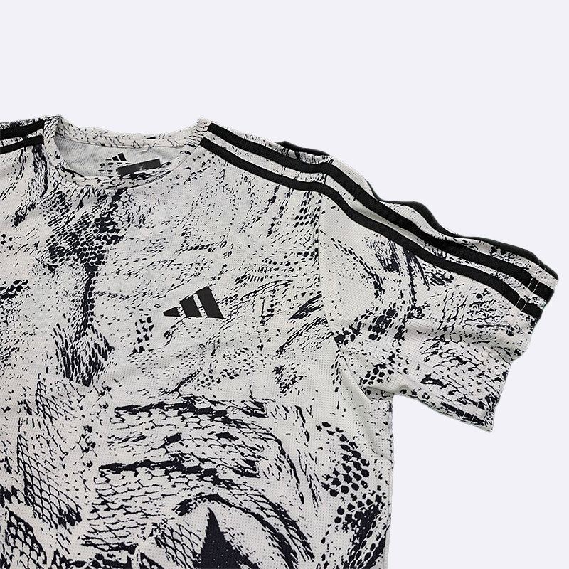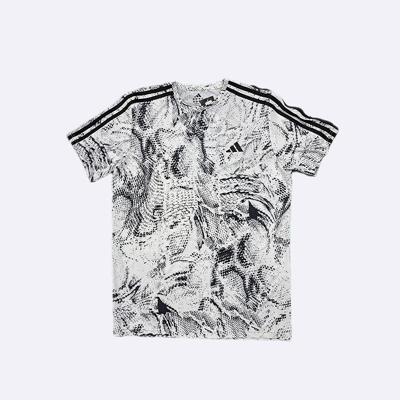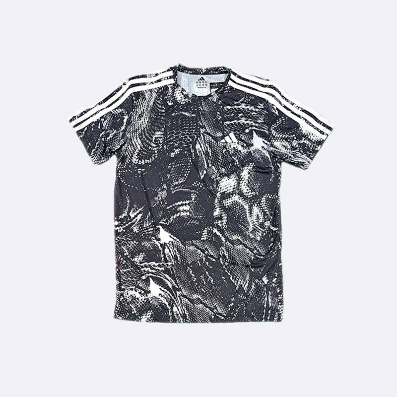 تي شيرت رياضي رجالي بتصميم عصري بنقشة مموهة، يتميز بلونين الأسود والأبيض. تظهر على الكتفين خطوط أديداس الثلاثة الشهيرة، كما يبرز شعار العلامة التجارية على الصدر. هذا التي شيرت مثالي للتمارين الرياضية