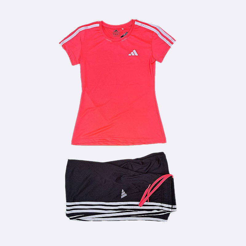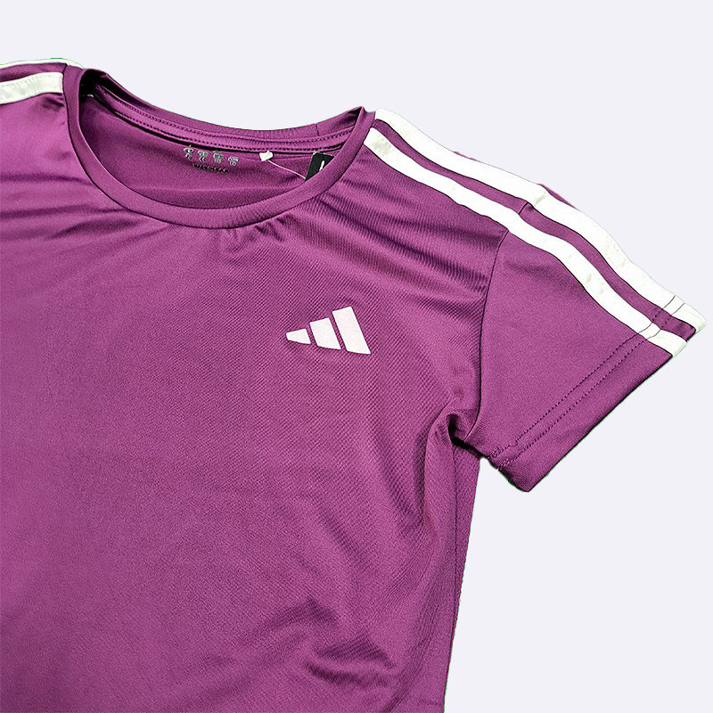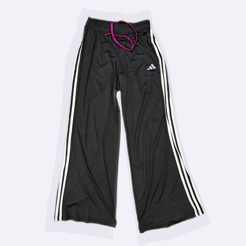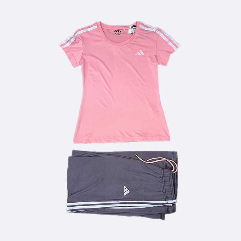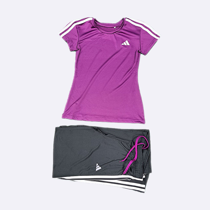طقم رياضي نسائي أنيق وعصري من أديداس يتكون من كنزة وبنطلون. تتميز الكنزة بلونها الموف الغامق مع خطوط أديداس البيضاء الشهيرة على الأكتاف وشعار العلامة التجارية على الصدر. يرافقه بنطلون باللون الرمادي،