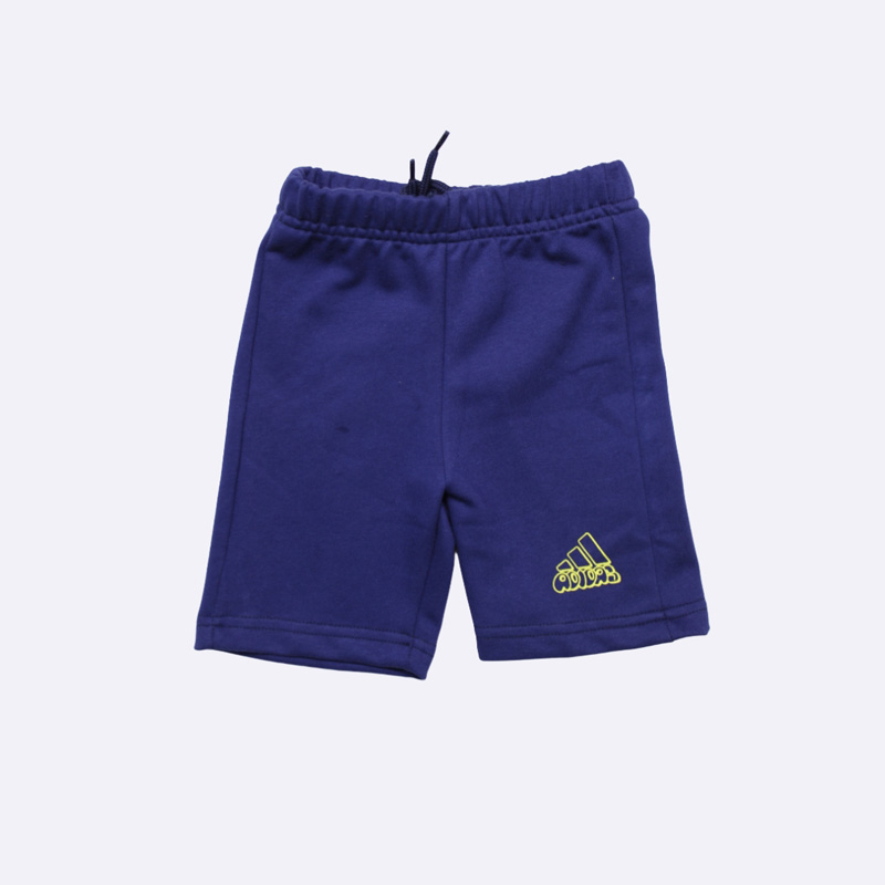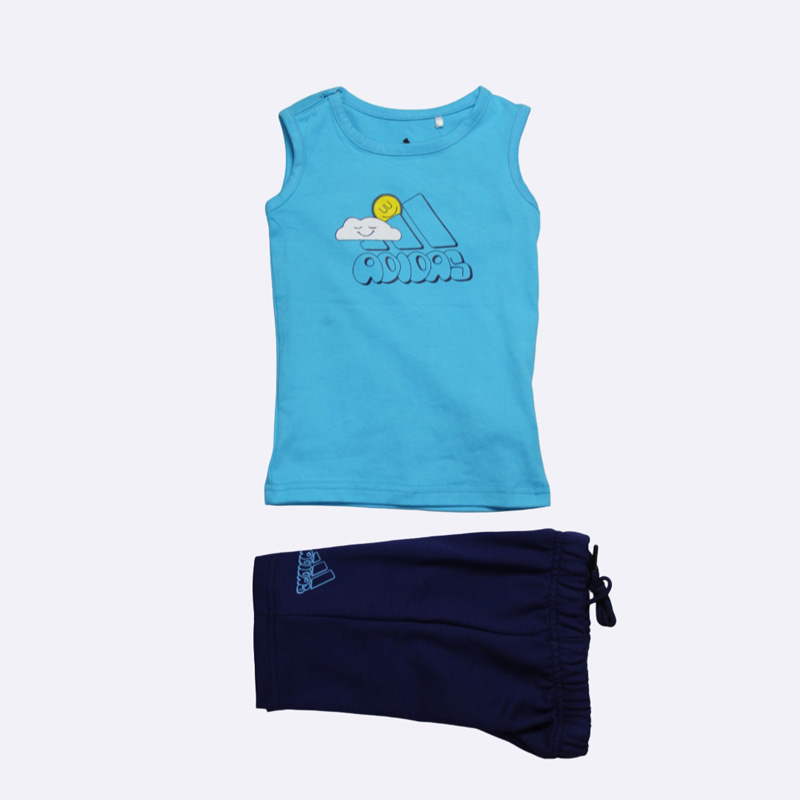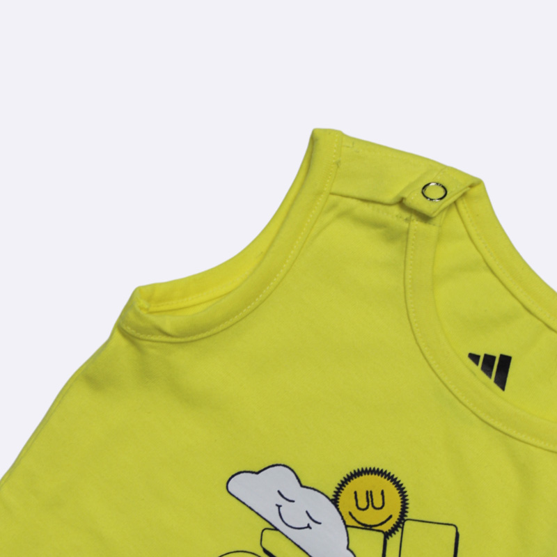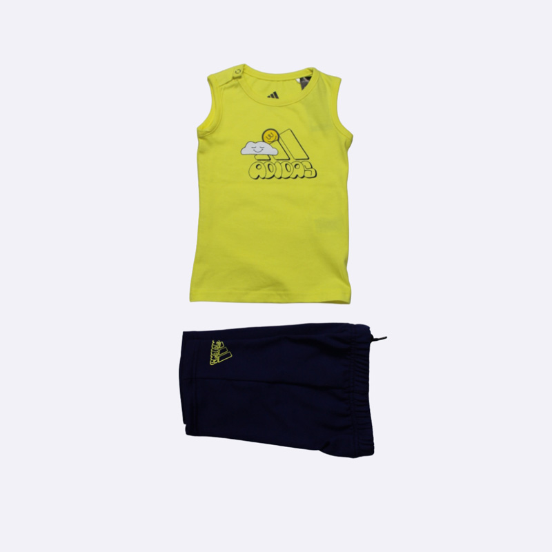 طقم بيجاما صبياني مريح وجذاب من أديداس، باللون الأصفر للأعلى والأزرق للأسفل. يتميز بتصميم مرح برسوم كرتونية وشعار أديداس. مثالي لنوم هانئ ولعب ممتع
